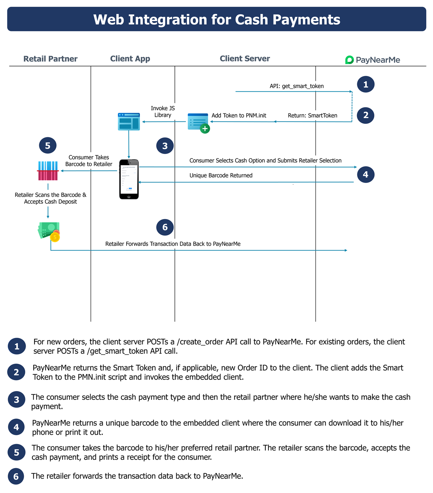 The payment process for electronic payments only requires one API call from the merchant. PayNearMe handles all data input and processing, so consumers can quickly make payments towards their bills. The following diagram displays a simplified dataflow of events for electronic payments (e.g., non-cash).