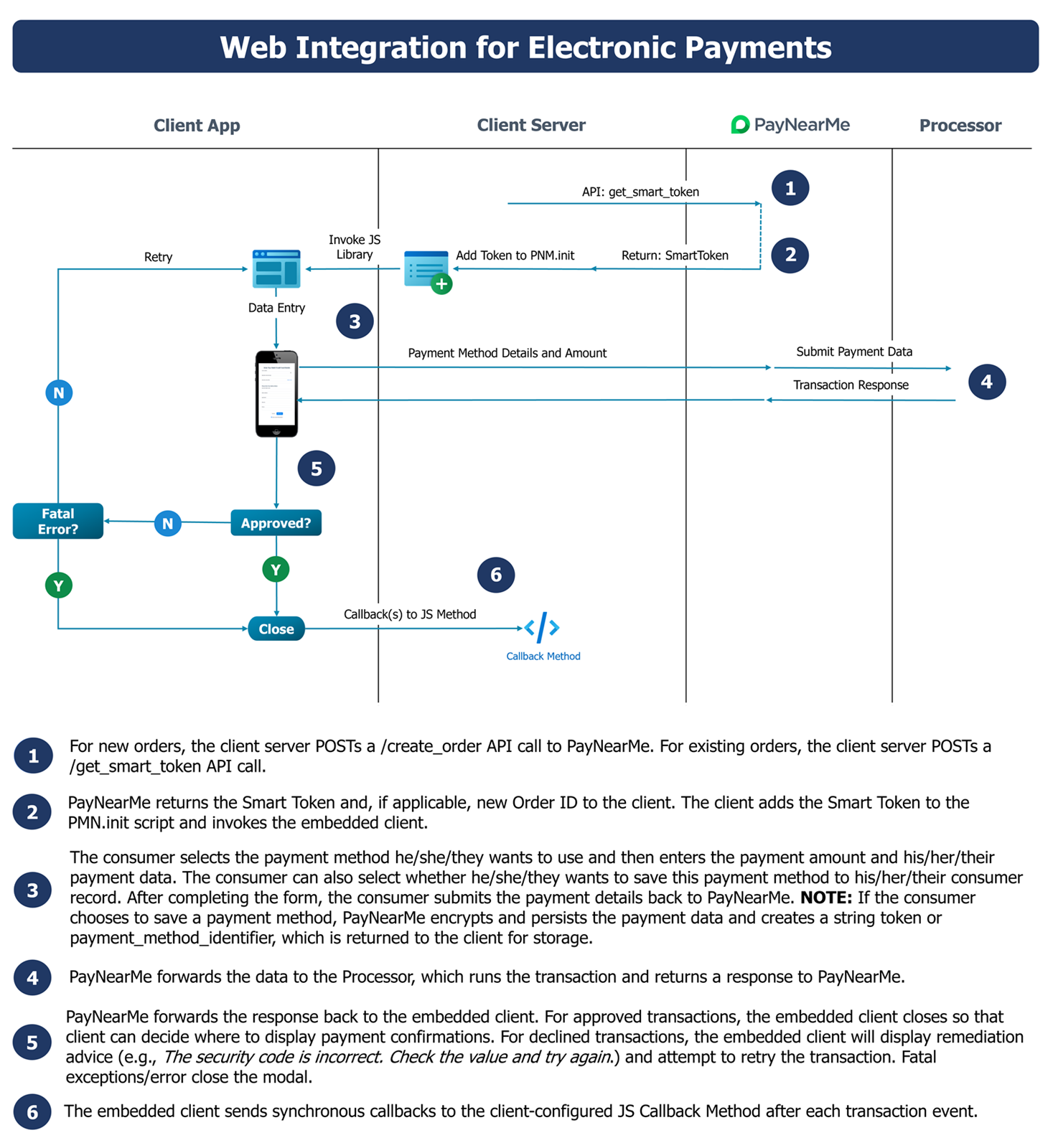 The Embedded Client leverages a PayNearMe-hosted, drop-in payment form that can capture consumer and financial data for payments, disbursements, tokenization, or Autopay schedules. Each form is generated by invoking a PayNearMe native or web JS library initialized with a session-timed token and a merchant-customized JS script. Tokens include encrypted data values that authenticate genuine PayNearMe orders. Merchants can define how many times consumers can access the form and for how long, and once accessed, how long the form will display until expiration. This protects sensitive data and helps prevent cross-site request forgery attacks.