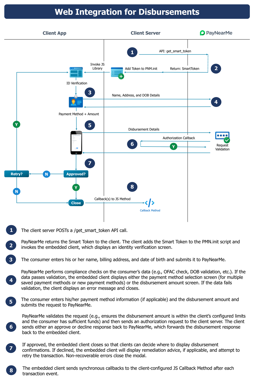 The disbursement process also requires only one API call from the merchant (get_smart_token). Disbursements require an existing Order ID for the consumer and, if configured, a saved payment method that can accept disbursement funds. Payment method requirements depend on your specific site settings. To allow consumers to create payment methods at the time of disbursement, consult with your Implementation Specialist about your site’s configuration. Additionally, disbursements require identity and compliance checks prior to money movement (e.g., funds cannot be transmitted to consumers on the OFAC Sanctions List). The following diagram displays the disbursement process.