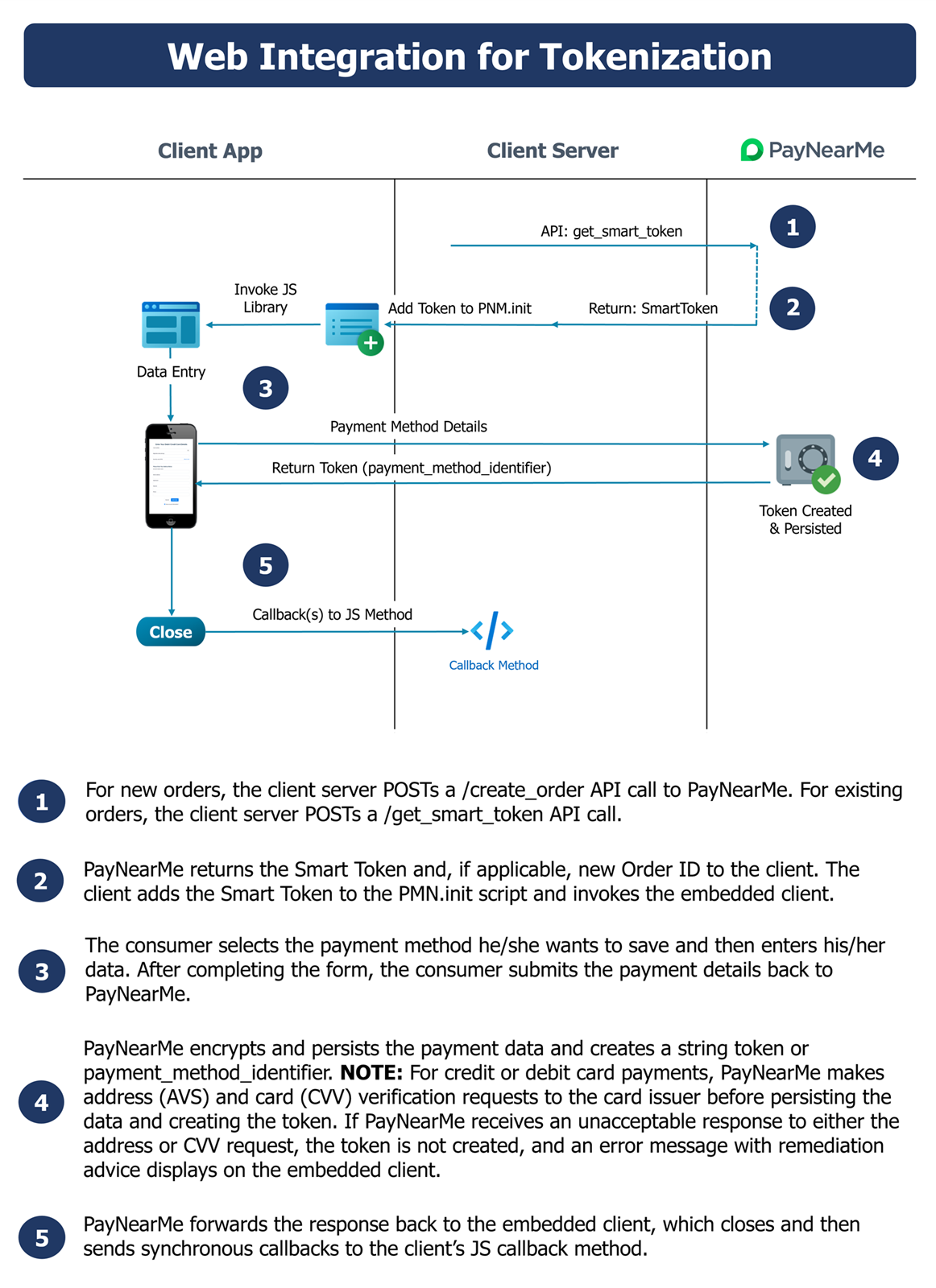 PayNearMe’s tokenization solution reduces your PCI scope and protects sensitive consumer data from bad actors. Giving consumers the ability to quickly add and save payment types they can use again and again makes both the payment and disbursement process easier and more efficient. This solution is for clients who already have their own proprietary UI or want full control over the UI/UX, but need a tokenization solution for safe, compliant payment data storage. The following diagram provides a basic flow of events for using PayNearMe’s tokenization solution.