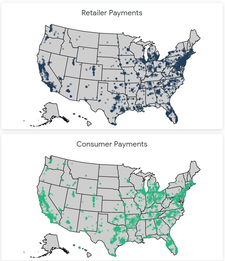 The Retailer Payment Counts and Consumer Payment Counts graph displays the geographic locations where consumers are making cash payments (i.e., Retailer Payment Counts) and electronic payments (i.e., Consumer Payment Counts). To see the total number of payments made within that zip code, hover over the corresponding dot on the map.