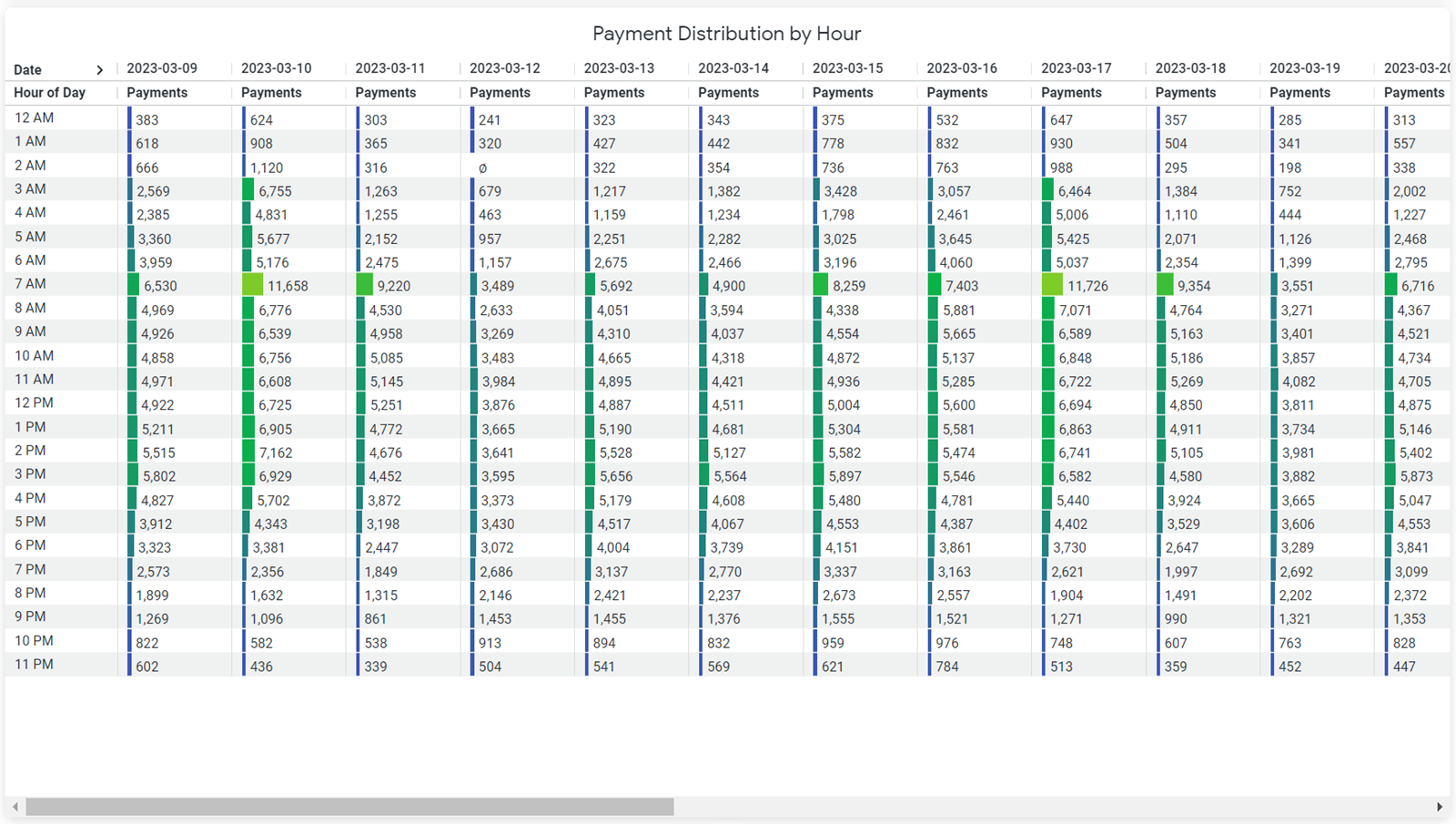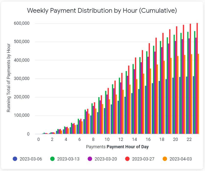 The Weekly Payments Distribution by Hour chart displays the cumulative number of payments made each hour for the specified week. For best results, set the Payment Date filter to any value under 30 days.