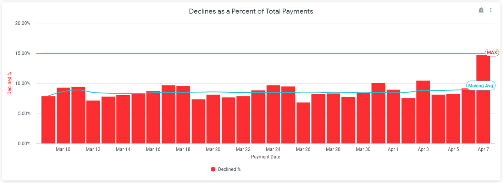 The Declines as a Percentage of Total Payments shows the ratio of declined transactions to total payments for that date. This chart also displays the maximum allowable percentage line for declines. To see the precise decline percentage for a particular date, hover over the corresponding bar in the graph.