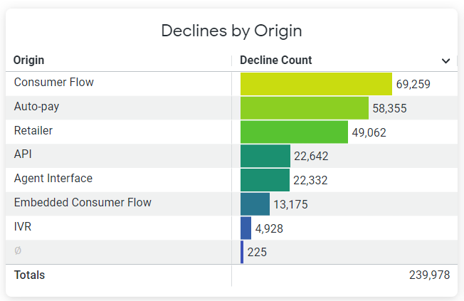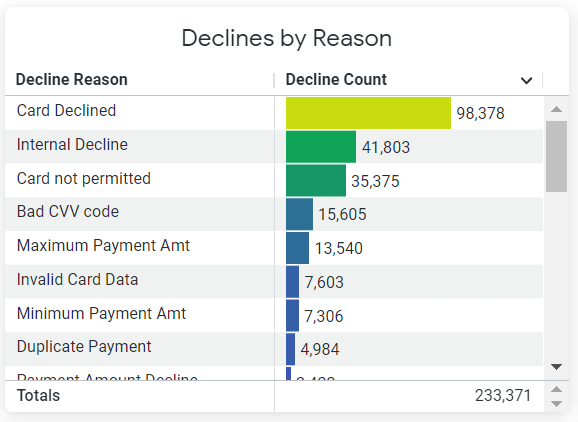 The Declines by Reason table displays the most common decline codes and a sum total of all the decline codes during the specified timeframe.