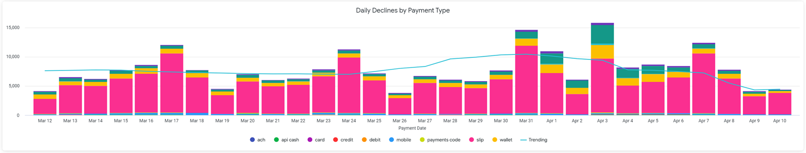 The Daily Declines by Payment Type chart displays transactions declines for specific payment types for each day of the specified timeframe. For best results, the Payment Date filter should be set at no more than the Last 30 Days.