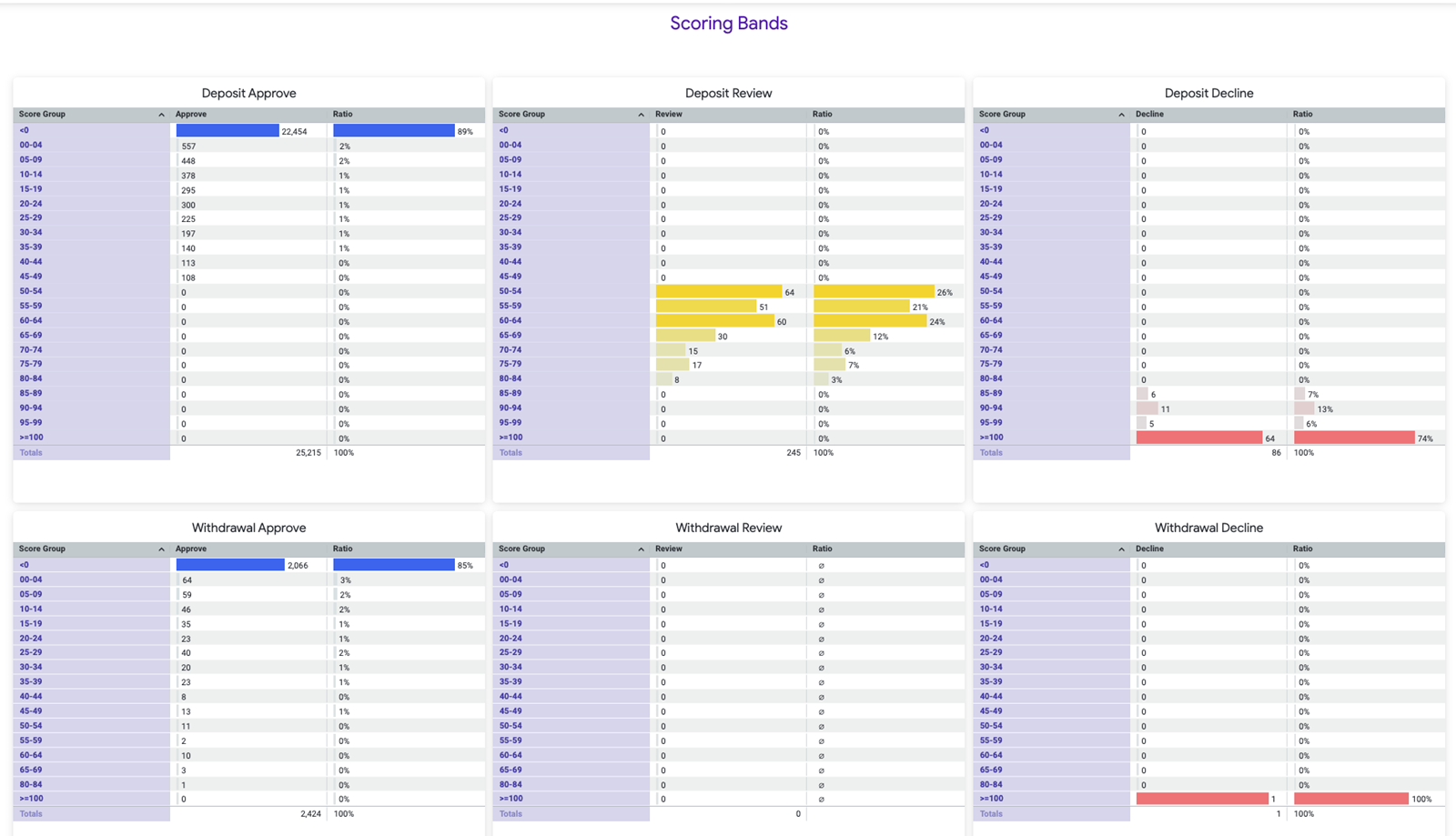 - Withdrawal: Approve/Review/Decline: Mirrors the deposit section, focusing on the distribution of withdrawal transactions by score range.