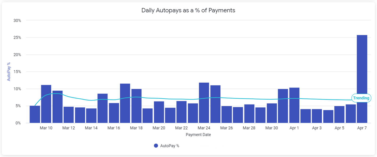 The Daily Autopays as a Percentage of Payment chart shows the ratio of autopay payments to total payments for each day of the month. To see the precise autopay payment percentage for a particular date, hover over the corresponding bar in the graph. For best results, the Payment Date filter should be set at no more than the Last 30 Days.