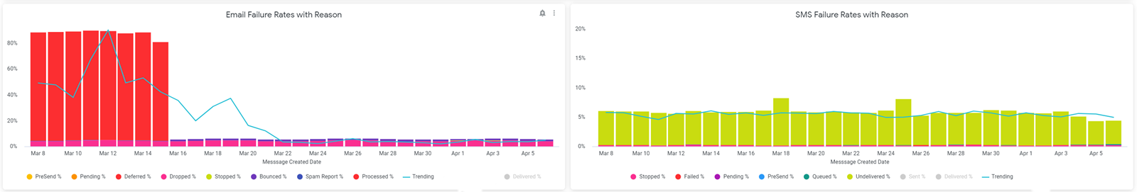 The Email and SMS Failure Rates with Reasons charts display the ratio of failed email and SMS messages to the total number of email and SMS messages sent that day and provides reasons for the failures. To see the exact percentage of failed messages for a specific reason, hover over the corresponding bar in the graph. For best results in both charts, the Payment Date filter should be set at no more than the Last 30 Days.