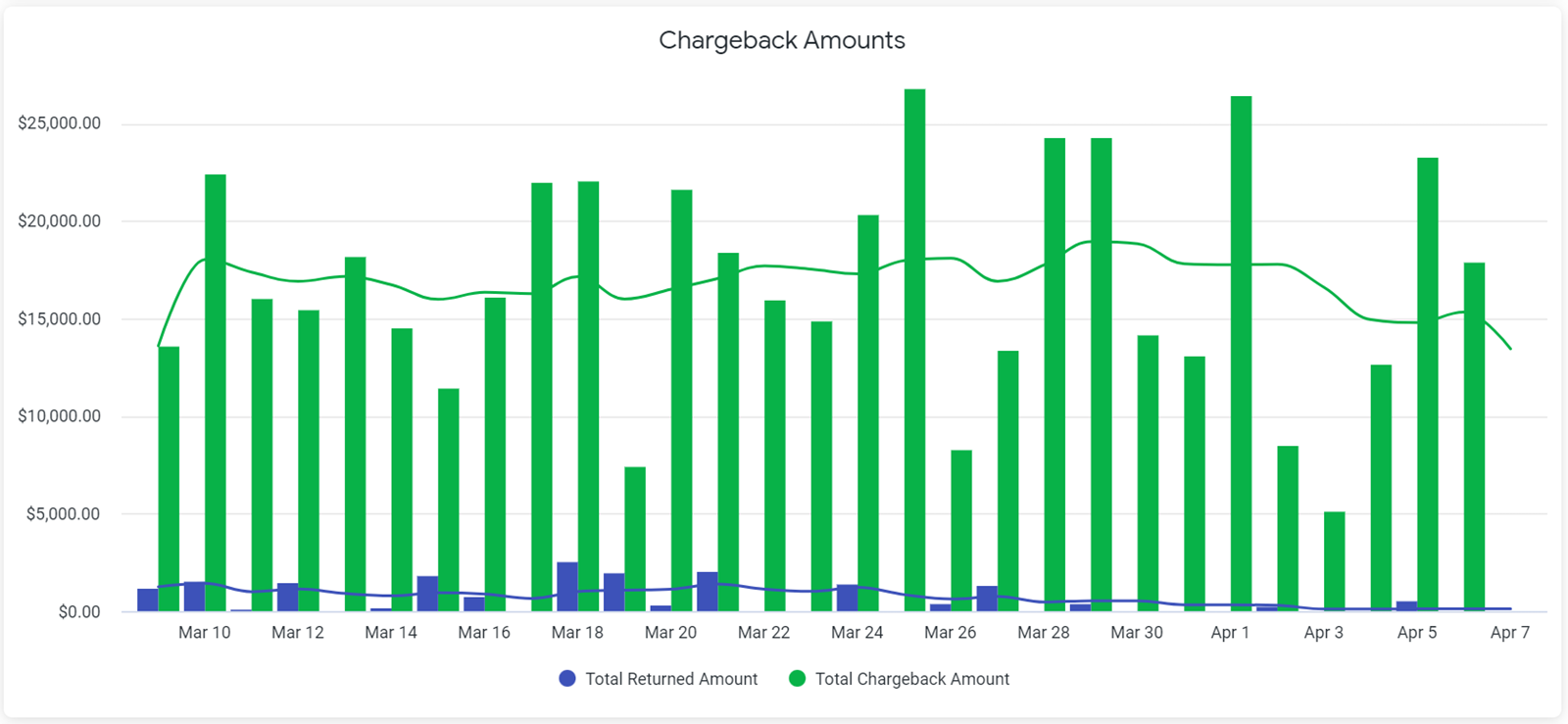 The Chargeback Amounts chart displays the total amount that was charged back and the total amount that was returned for a specific date. To see the precise chargeback amount or the precise returned amount for a particular date, hover over its corresponding bar in the chart. For best results, the Payment Date filter should be set at no more than the Last 30 Days.