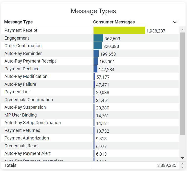 The Message Types chart displays the total number of each type of engagement message that was sent during the specified timeframe.
