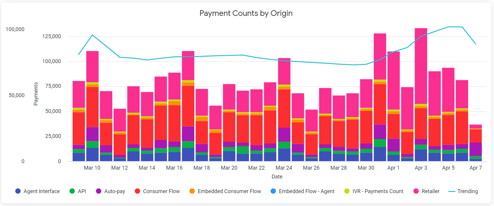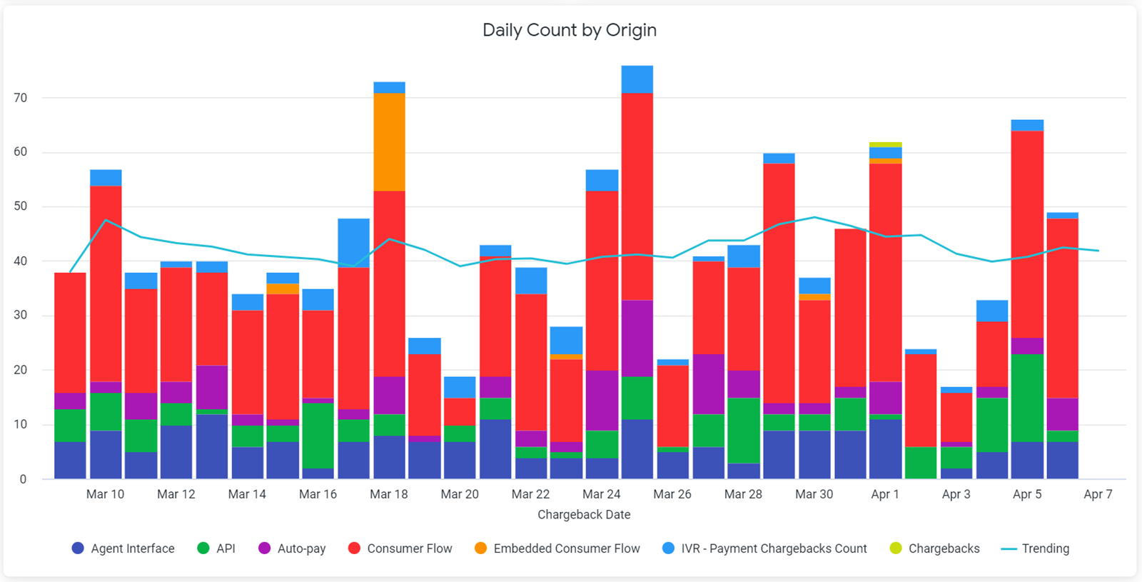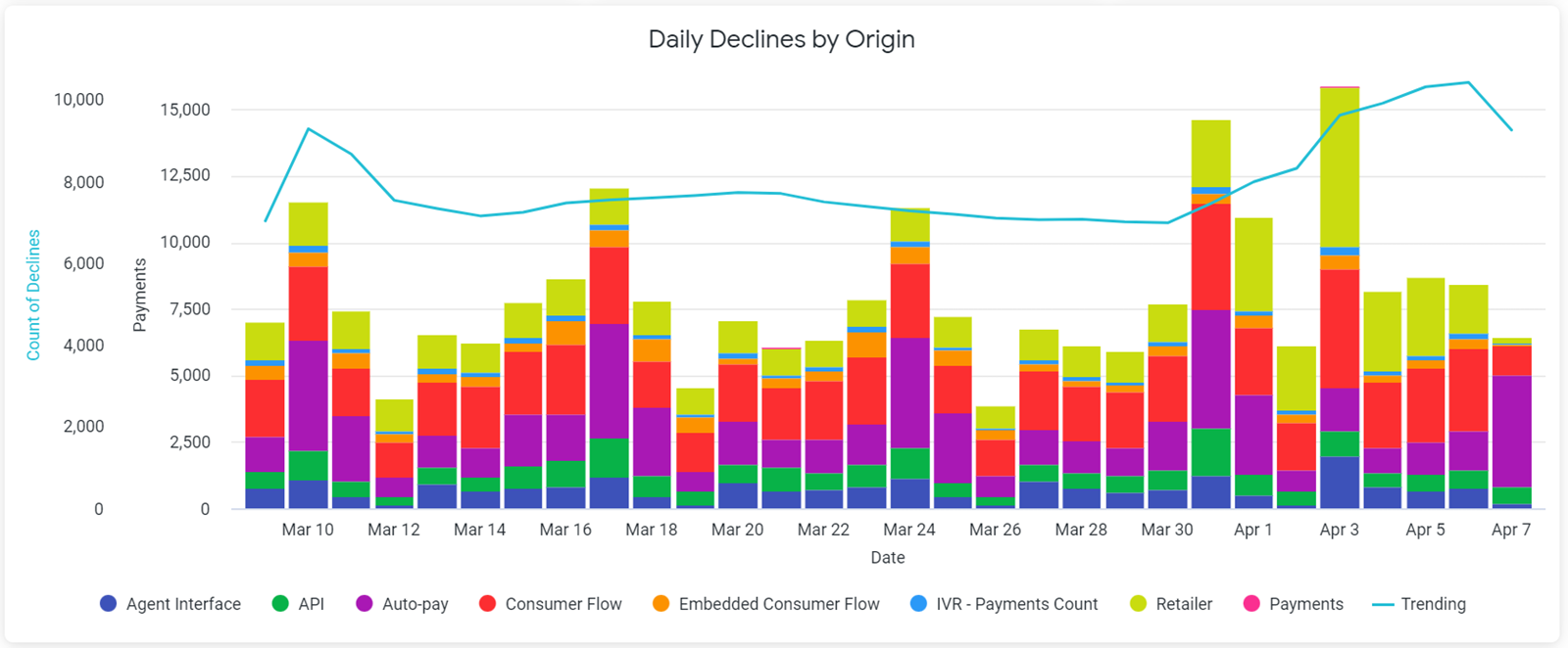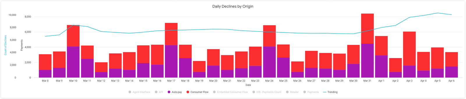 Nearly every chart that displays on the dashboards contain variables. These variables can range from payment types and origins, decline/return reasons, chargeback types and origins, autopay types, and engagement types. To add or remove a variable from a chart, simply click the colored dot that displays next to the variable’s name in the chart key. Below is a chart displaying daily transaction declines by origin.