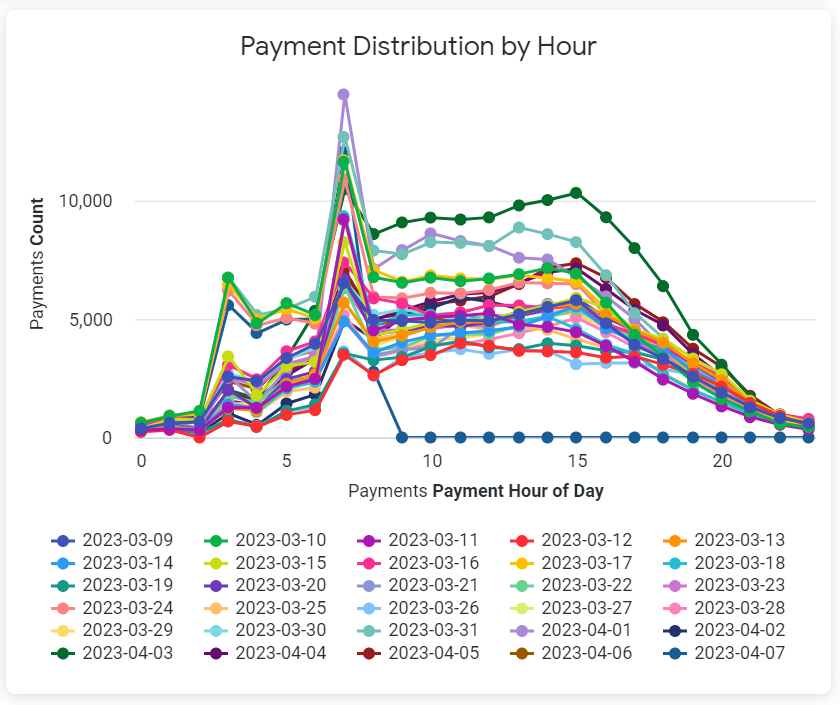 The Payments Distribution by Hour chart displays the exact number of payments made each hour of the day. For best results, set the Payment Date filter to a value that is no more than 7 days. Ideally, these charts should display data for 1-2 days.