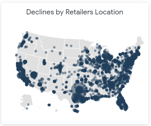 The Declines by Retailer Location graph displays the geographic locations where cash transactions have declined within the specified timeframe. To see the total number of declines that occurred within that zip code, hover over the corresponding dot on the map.