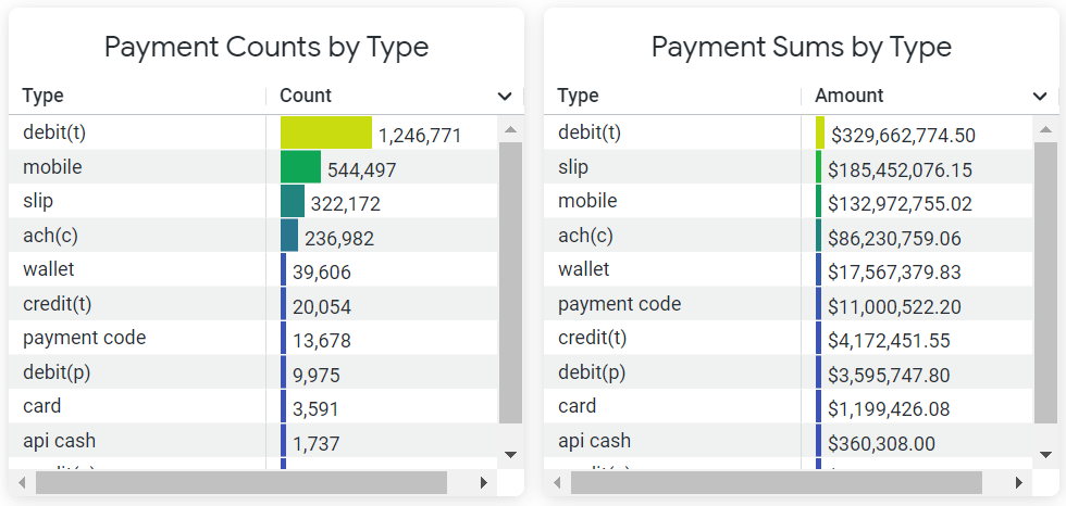 Use these tables to evaluate the payment methods that consumers are using to make payments. The Payment Counts by Type table displays the total number of payments made with each payment type, while the Payment Sums by Type table displays the sum total of payments for each payment type.