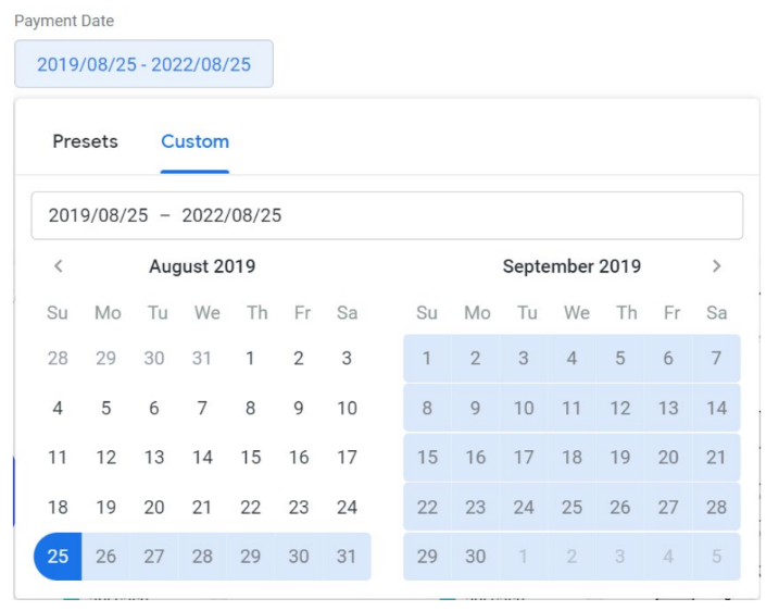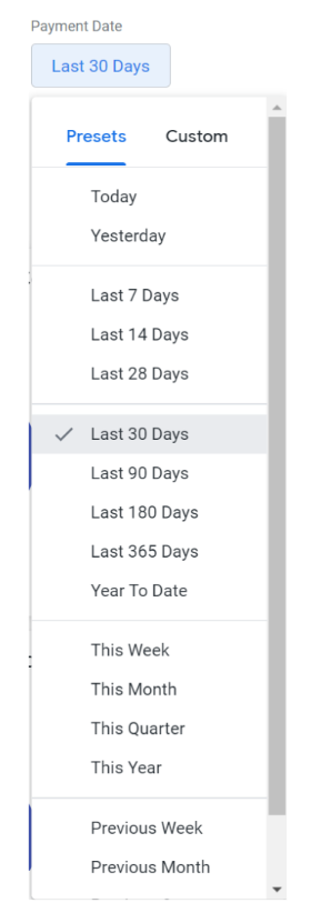 Use the Payment Date filter to choose from 18 different predefined date ranges. These ranges can go up to a year prior.