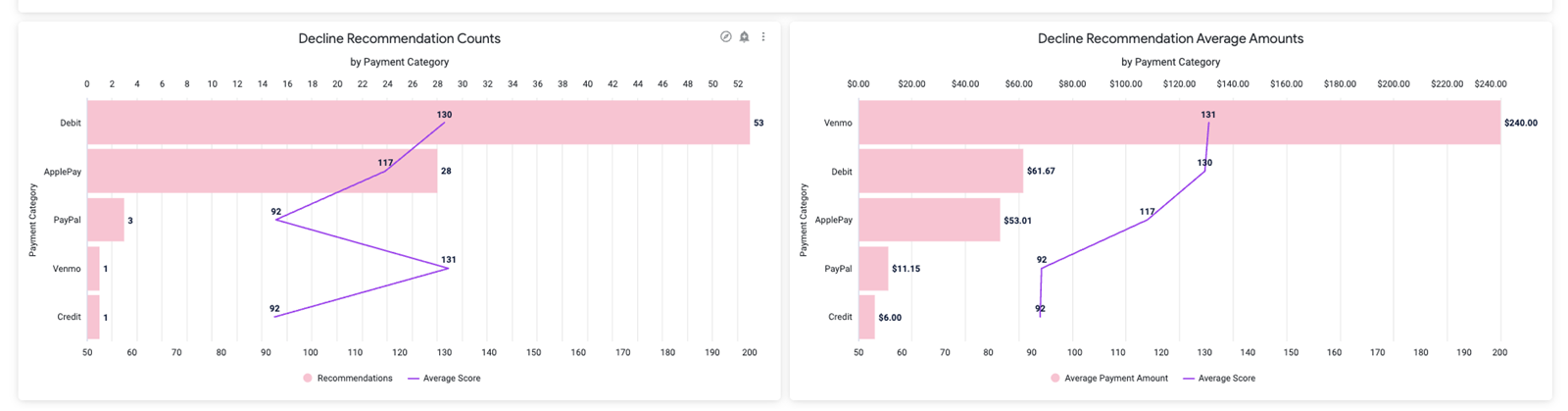 These charts provide a detailed breakdown of declined transactions by payment category, highlighting both the frequency and average dollar amounts of declines alongside their associated average risk scores, to help identify high-risk and high-exposure payment methods.