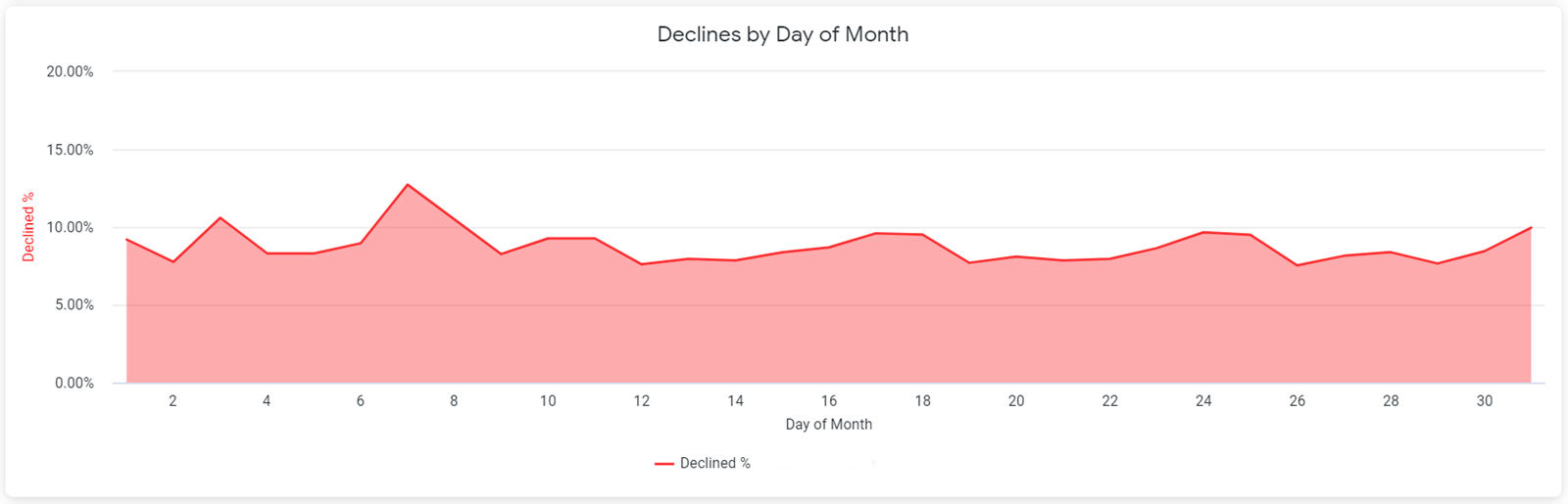 The Declines by Day of the Month chart displays the decline percentage for specific days of the month. To see the percentage for a particular day of the month, hover over that point in the graph.
