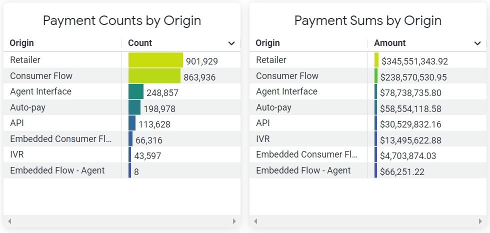 Use these tables to evaluate how consumers are making payments on the PayNearMe platform. The Payment Counts by Origin table displays the total number of payments made for each PayNearMe product, while the Payment Sums by Origin table displays the sum total of payments for each PayNearMe product.