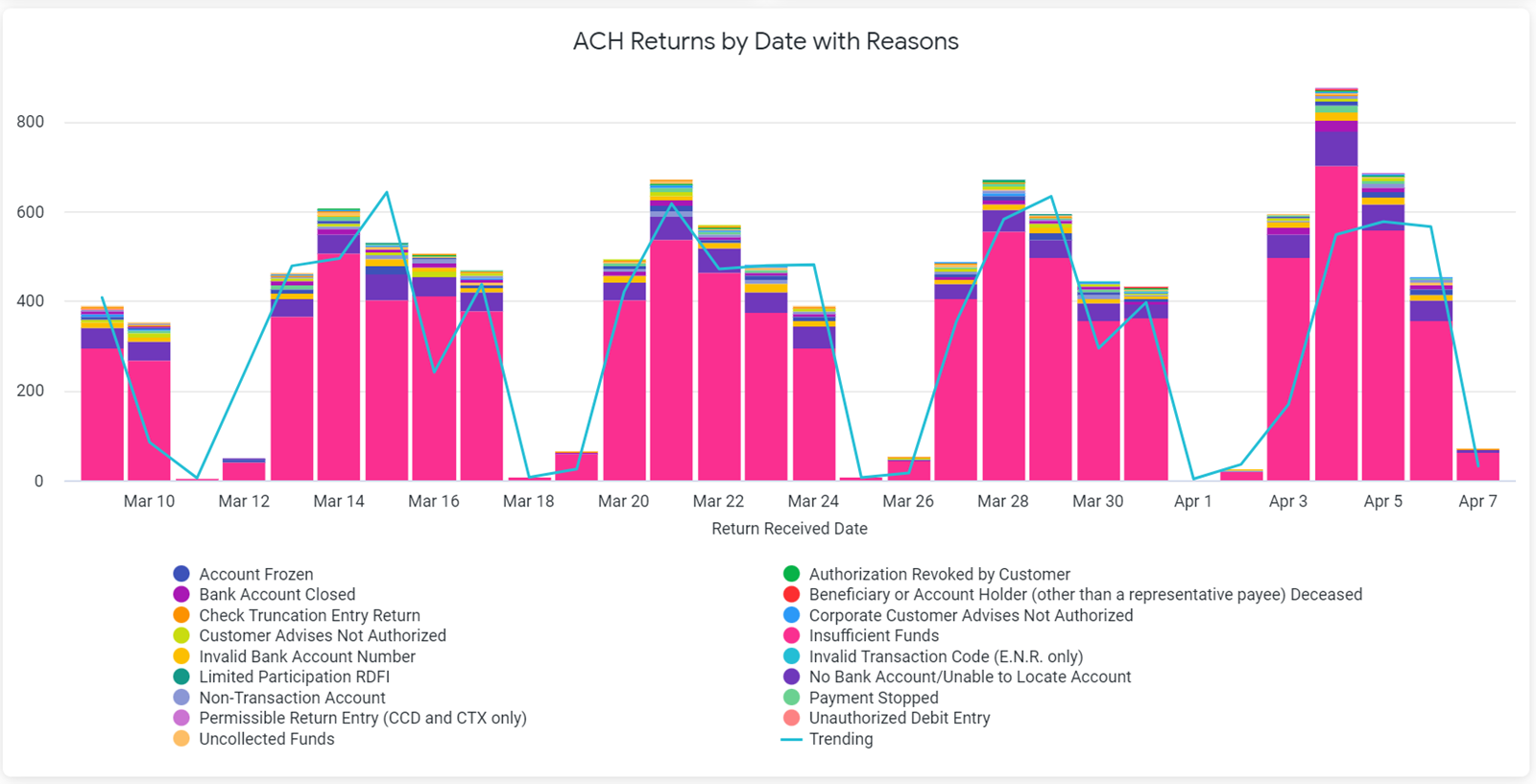 This data is also displayed in the ACH Returns by Date with Reasons chart, which displays the number of returns and the reasons for the returns for a particular date within the specified timeframe. Hover over the corresponding bar to see the reason for the return and how many returns were made that day. For best results, the Payment Date filter should be set at no more than the Last 30 Days.