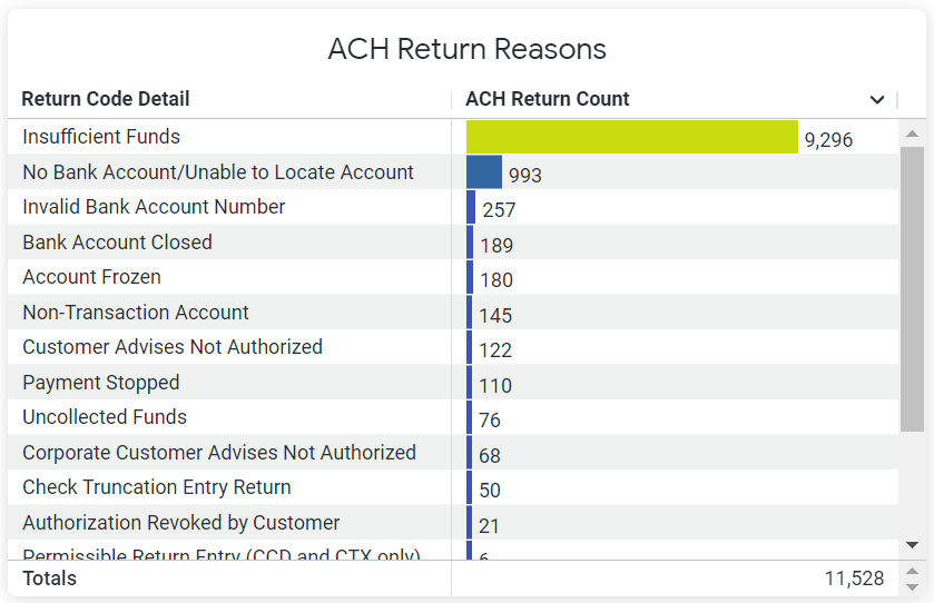 The ACH Return Reasons table displays the most common return reasons and a sum total of all the returns during the specified timeframe.