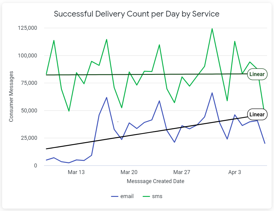 The Successful Delivery Count Per Day by Service chart displays the total number of SMS and Email engagement messages that were successfully sent each day. To see the precise number of messages sent via email or SMS on a specific date, hover over the corresponding point in the graph. For best results, the Payment Date filter should be set at no more than the Last 30 Days.