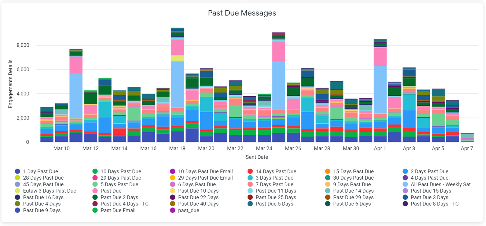The Past Due Messages chart displays the total and type of past due messages sent for a particular day. To see the exact total for a particular type of past due message on a specific date, hover over the corresponding bar in the graph. For the best results in both charts, the Payment Date filter should be set at no more than the Last 30 Days.