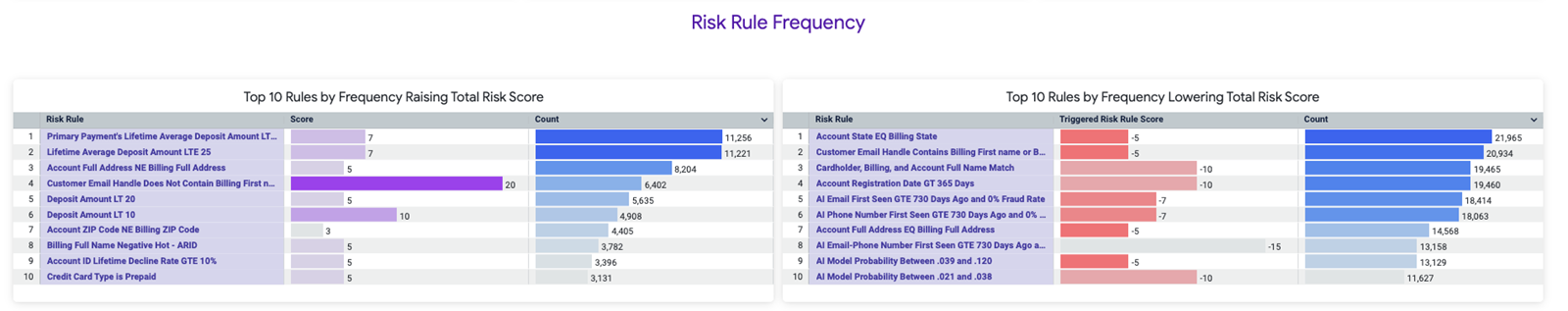 These high-level metrics offer an at-a-glance understanding of how your transactions are being evaluated by the risk engine.