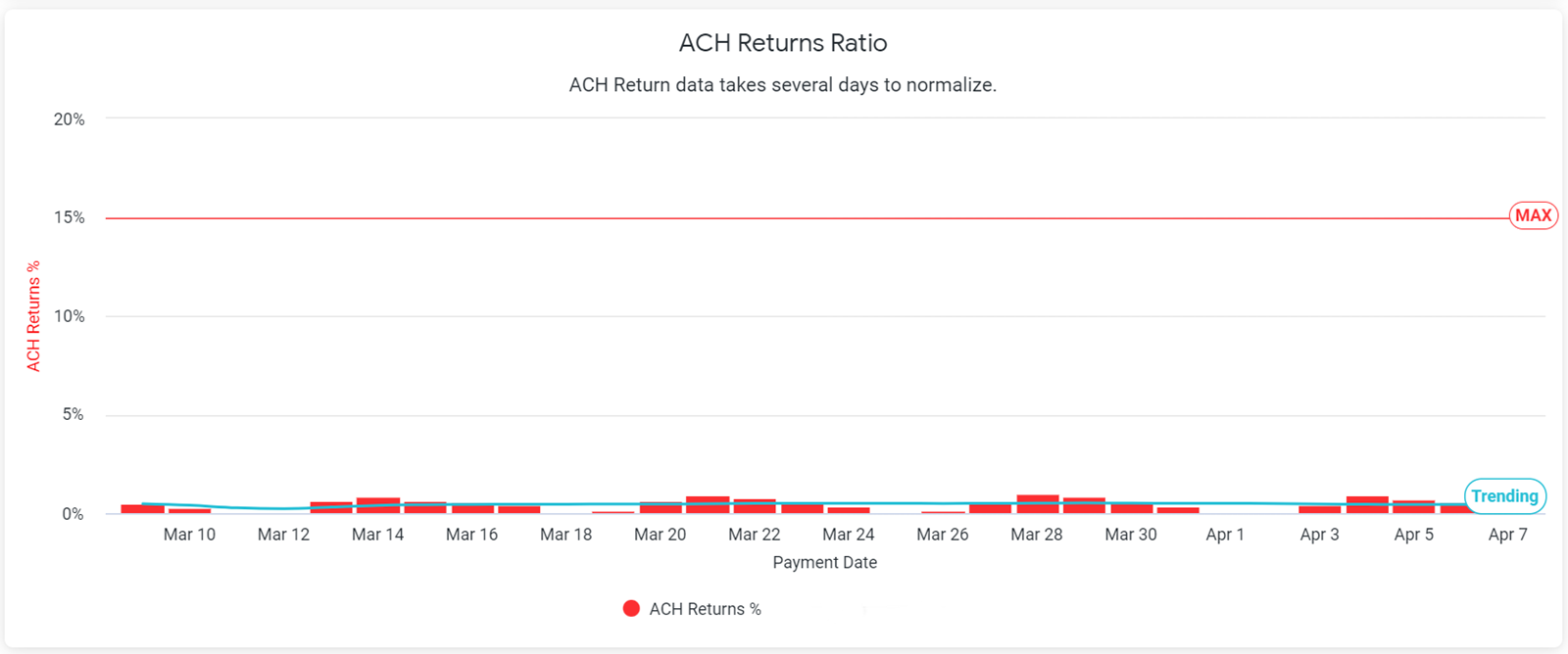 The ACH Returns Ratio chart shows the percentage of returned ACH transactions to total payments for that date. This chart also displays the maximum allowable percentage line for returns. To see the precise return percentage for a particular date, hover over the corresponding bar in the graph.