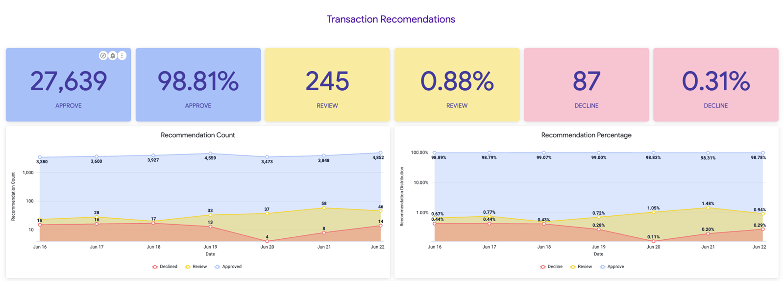 The Transaction Recommendations dashboard provides a comprehensive view of the distribution and frequency of automated risk-based decisions—Approved, Review, and Declined—across your payment activity. This tool enables effective monitoring of the risk model's impact on transaction outcomes. Quickly assess overall performance with summary tiles that display the count and percentage of each recommendation type: