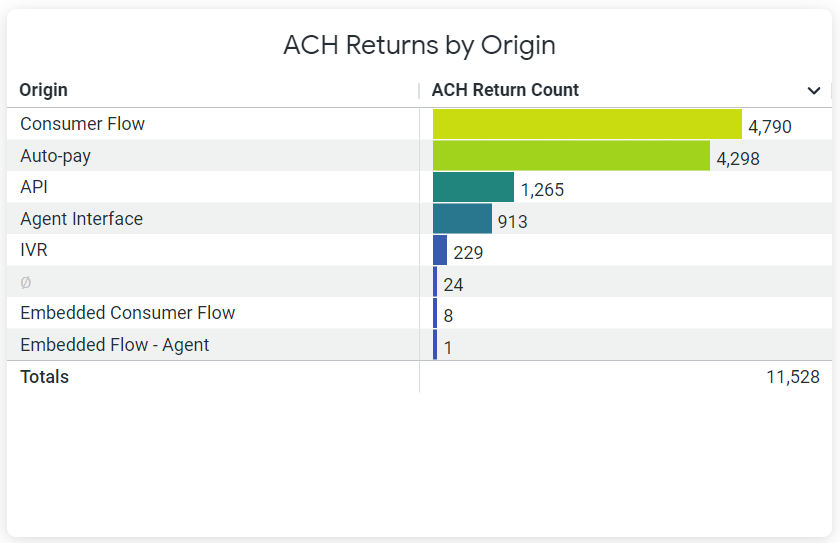 Use the ACH Returns by Origin chart to view how many ACH transactions were returned for each PayNearMe product within the specified timeframe.