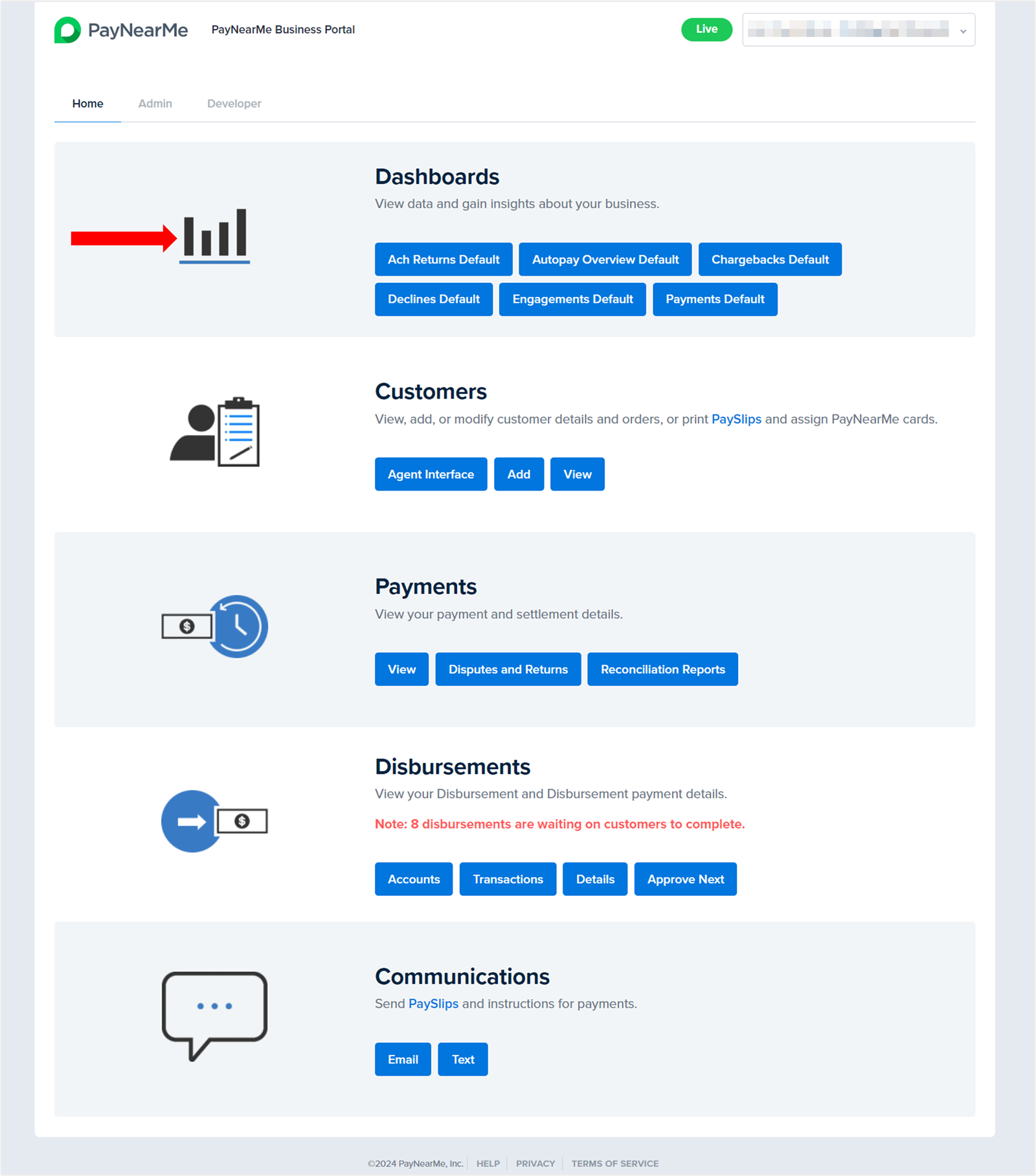 Your PayNearMe Technical Account Manager (TAM) will activate your dashboards for your Business Portal. To access them, simply log into the portal and, if not already selected, click on the Home tab. The dashboards will display under the Dashboards section.