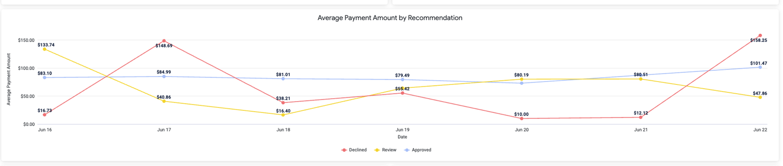 Hover over any data point to view the precise average payment amount for a specific date and recommendation category.