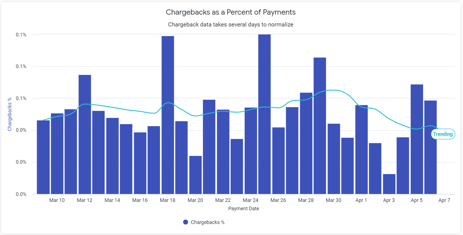 The Chargebacks as a Percentage of Payment chart shows the ratio of chargebacks to total payments for that date. To see the precise chargeback percentage for a particular date, hover over the corresponding bar in the graph. For best results, the Payment Date filter should be set at no more than the Last 30 Days.