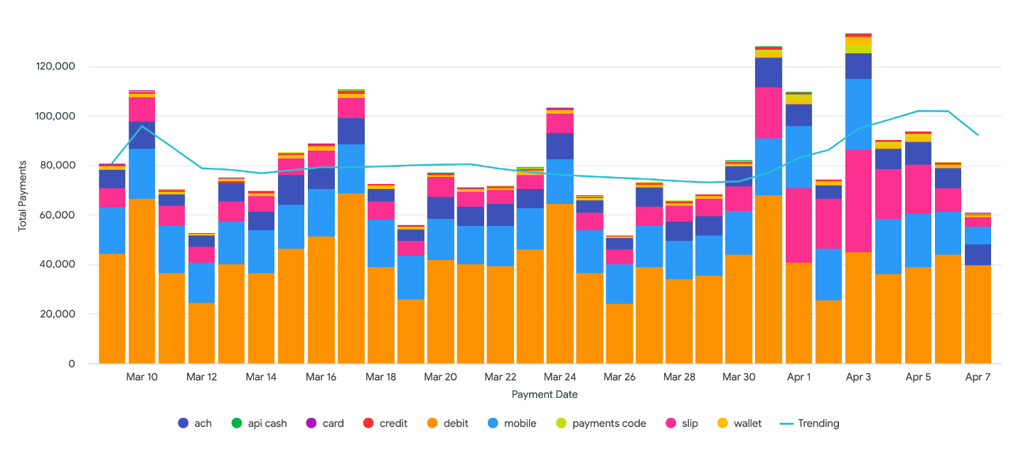The Payment Counts by Type table is also represented in a bar graph with the same name. To see the precise number of payments that were made with a payment type on a specific date, hover over its corresponding bar in the chart.