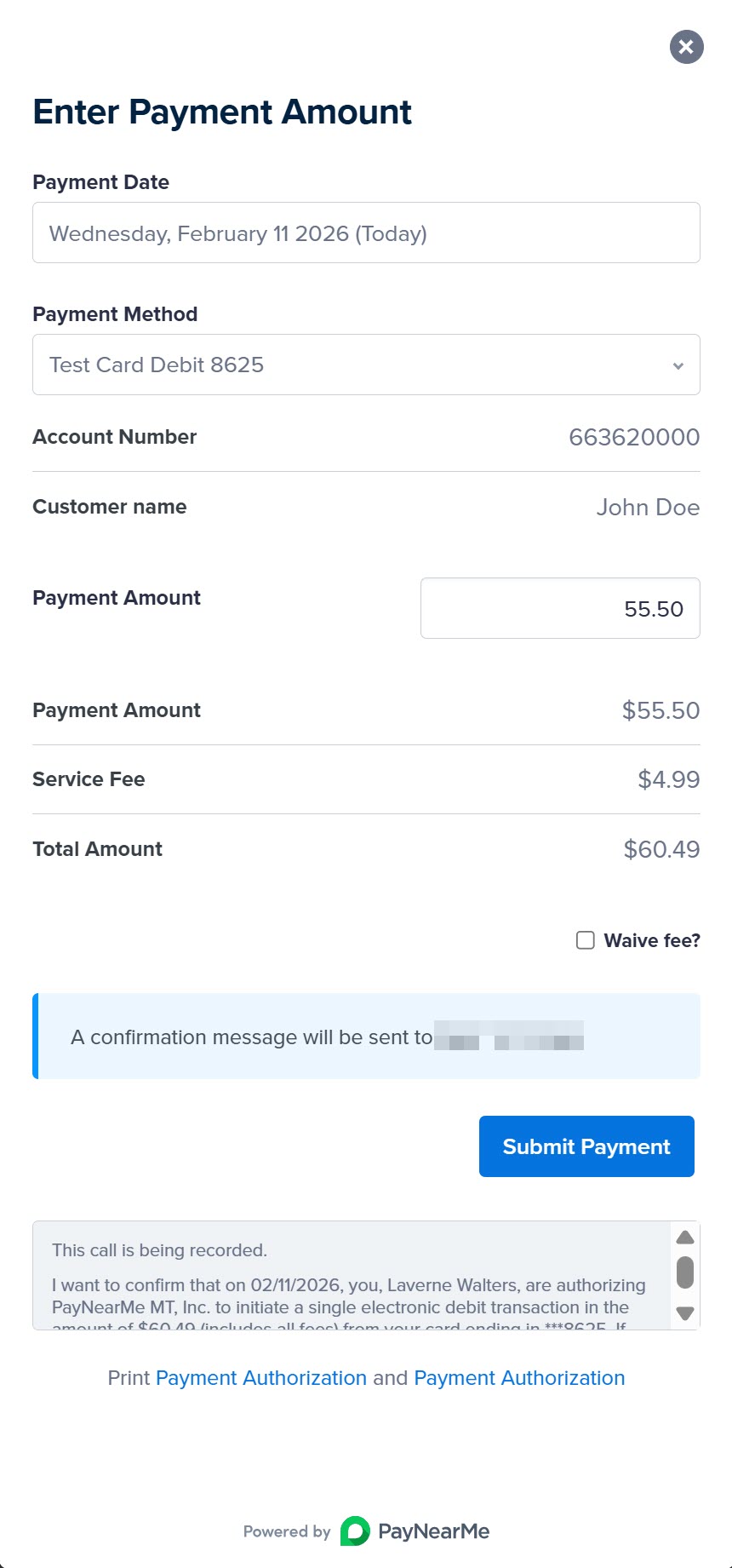 <script src="https://www.paynearme-sandbox.com/api/embedded/Ku6z6P5enC2PiTvrpazZ1g/script.js?pay=1&button=Pay"></script>After selecting an existing payment method or creating a new payment method, the Embedded Form renders the following screen requesting a payment amount and providing payment authorization verbiage: