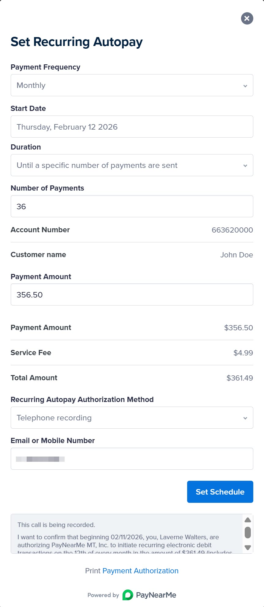 <script src="https://www.paynearme-sandbox.com/api/embedded/Ku6z6P5enC2PiTvrpazZ1g/script.js?schedule=1&button=Pay"></script>After selecting an existing payment method or creating a new payment method, the Embedded Form renders the Set Recurring Autopay screen where the agent can select scheduling options on behalf of the consumer.