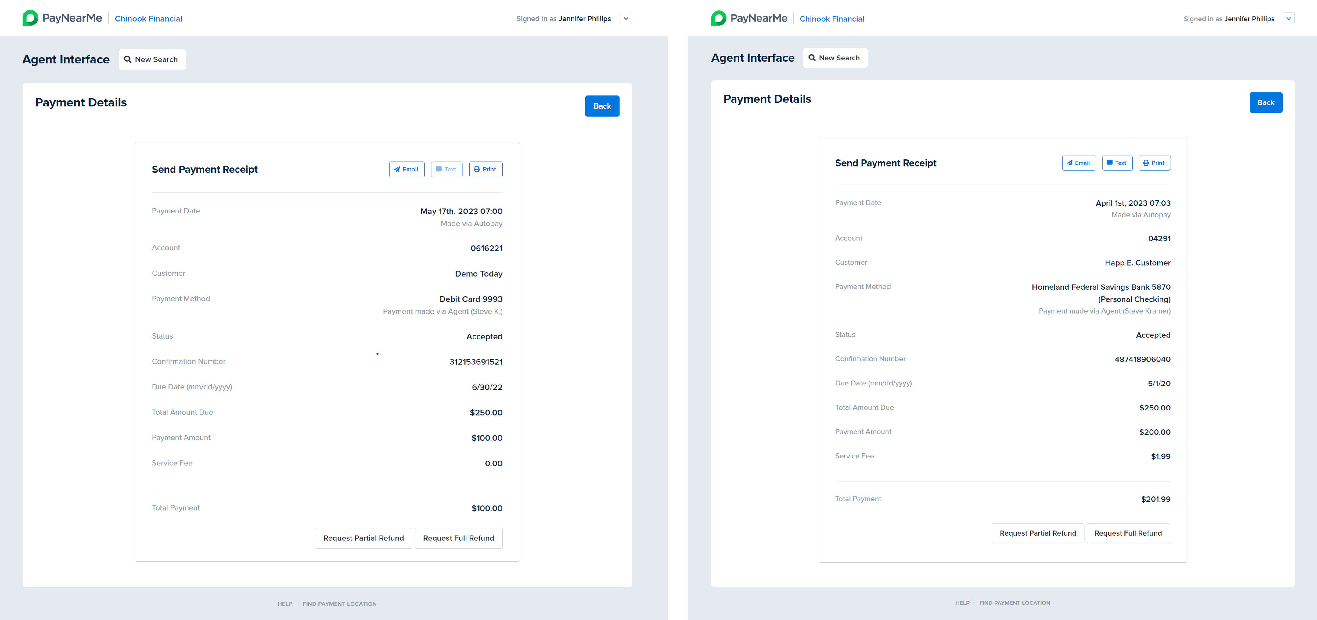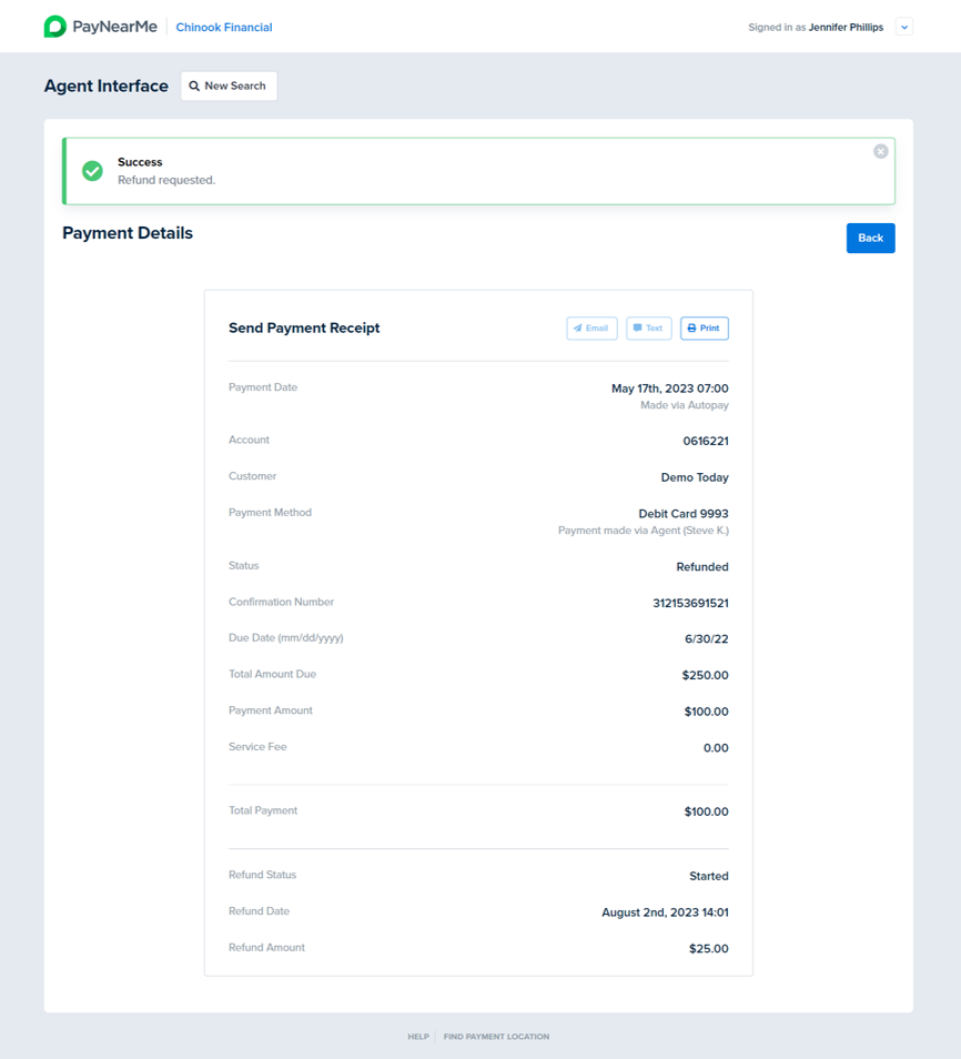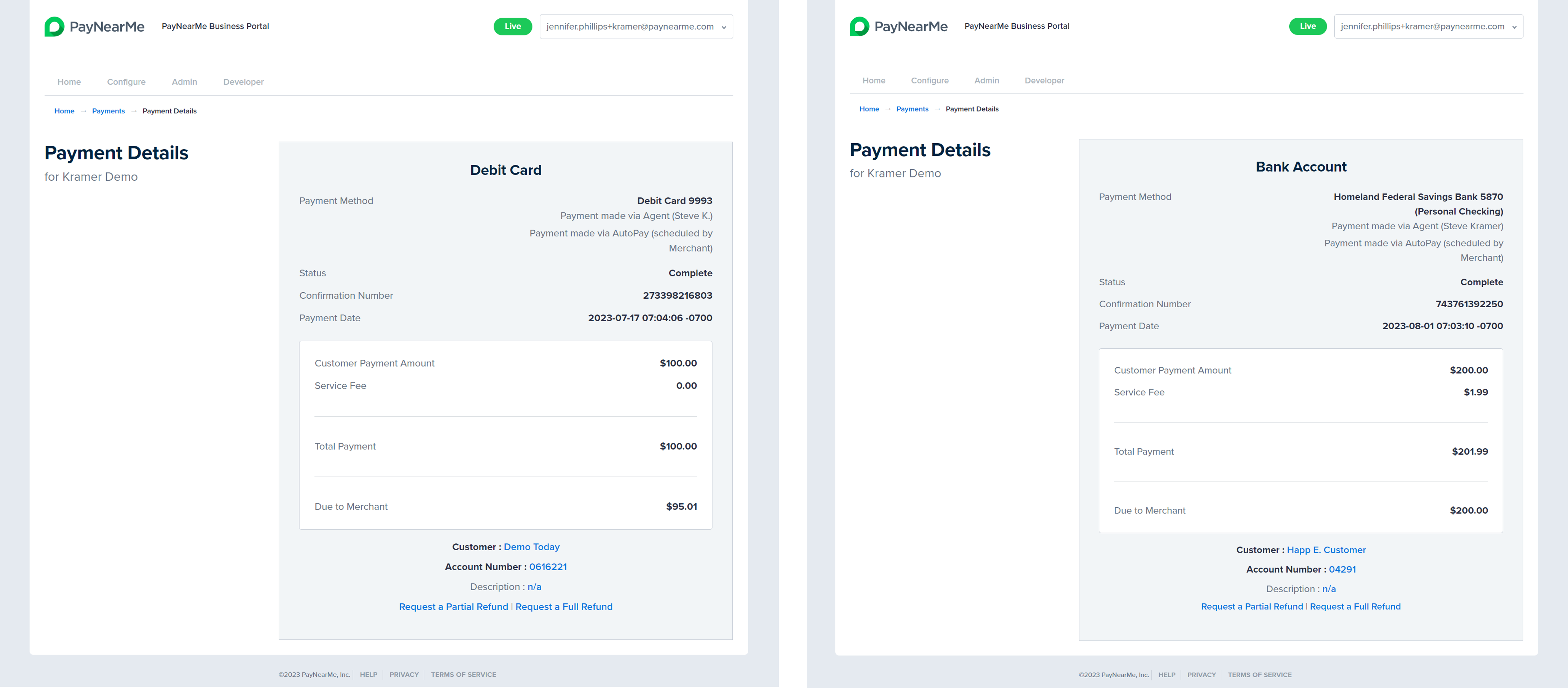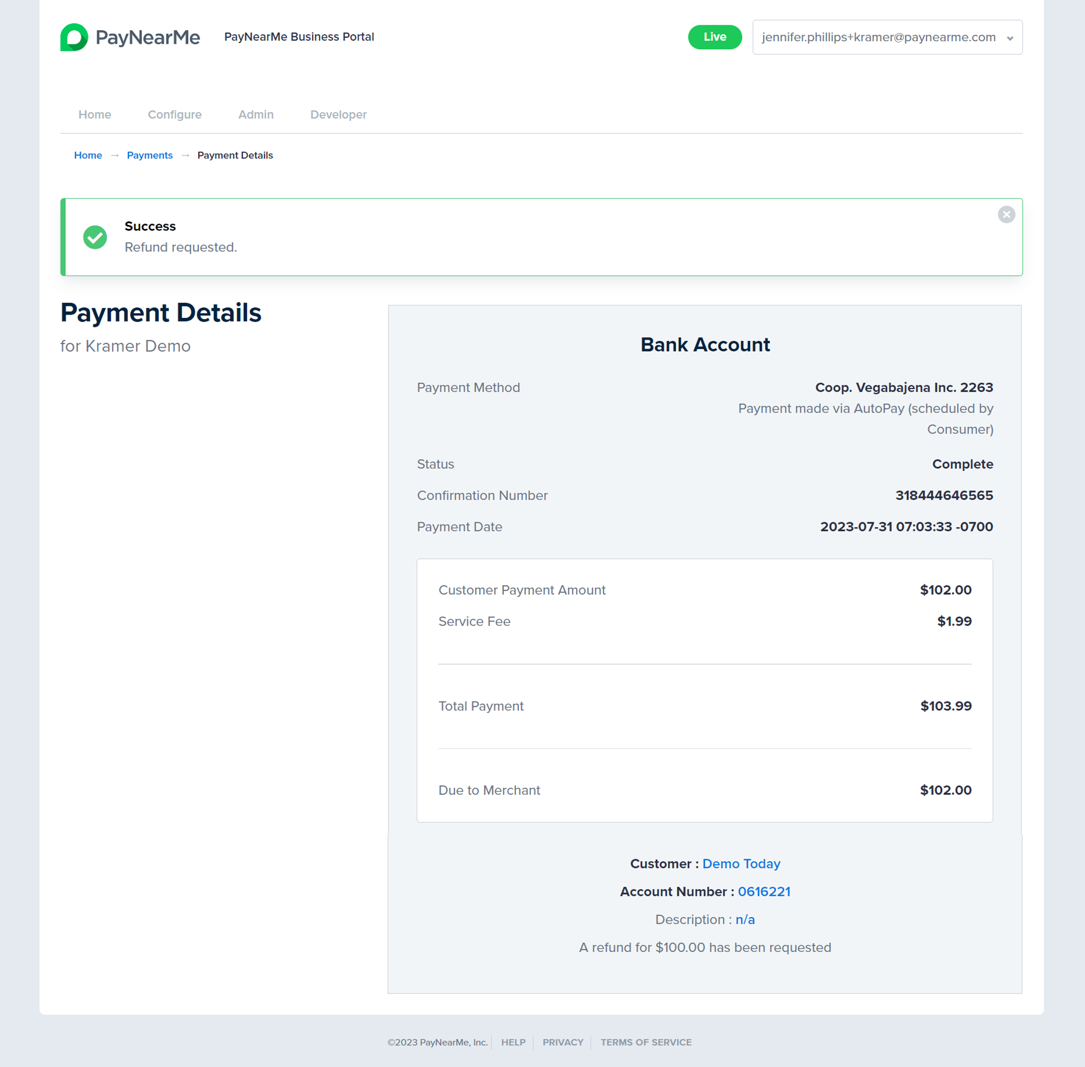 PayNearMe enables clients to issue both partial and full-amount refunds to consumers from both the Business Portal and via the /refund_payment API. Refund requests can be made for both credit/debit card transactions and ACH transactions once the cancellation window has passed. After submitting the refund request, both the consumer and client receive refund confirmation emails. PayNearMe also provides clients with a report at their desired cadence that details all the card and ACH refunds processed for a given time period.
