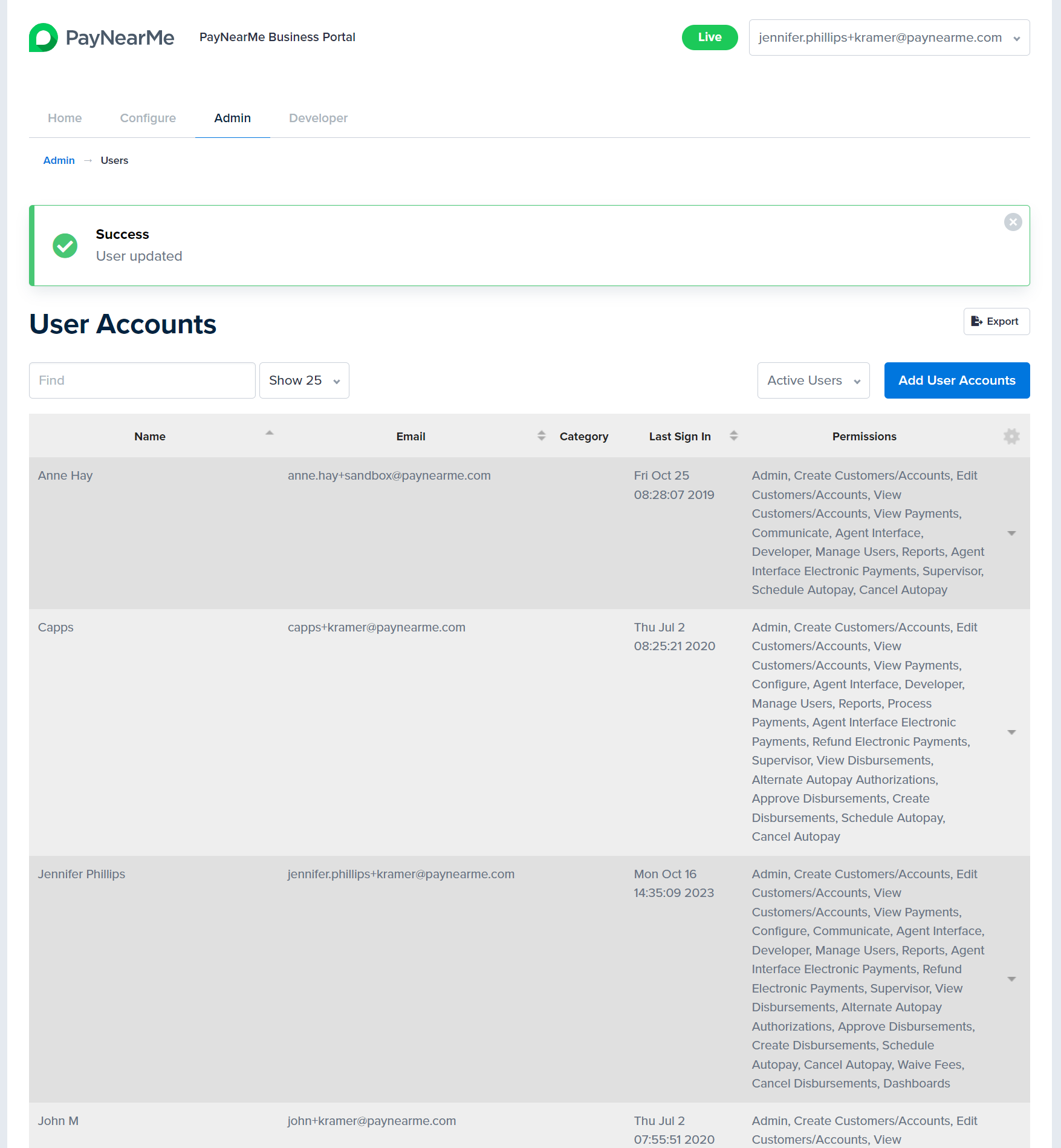 Click Update. The Business Portal returns you to the User Accounts page and displays a message indicating whether or not the user account was successfully updated.