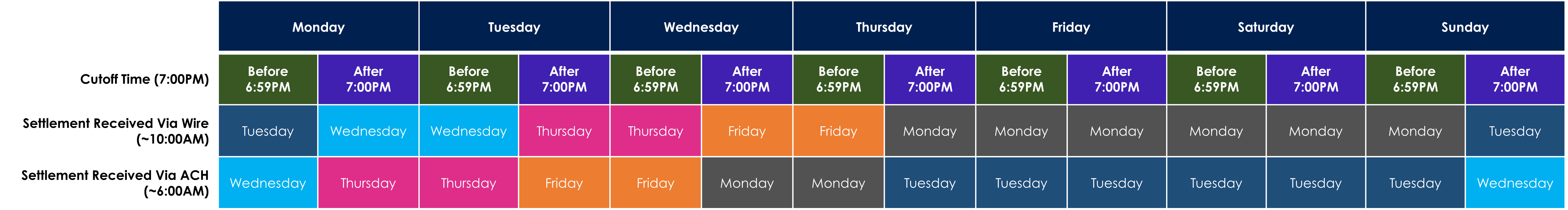 Reconciliation reports follow the settlement funding model timelines displayed below. Transactions included in the Reconciliation report could have different cut-off times than transactions included in the Daily Payments report.