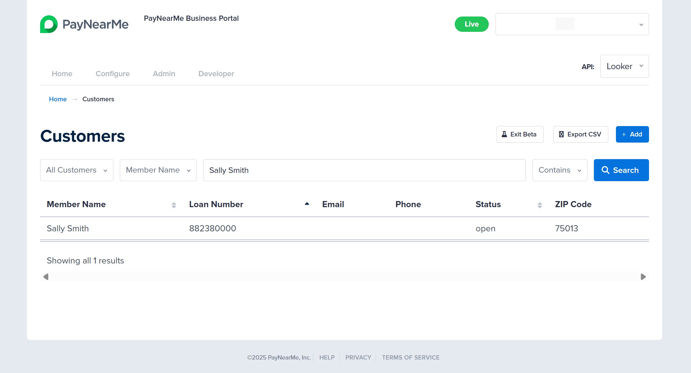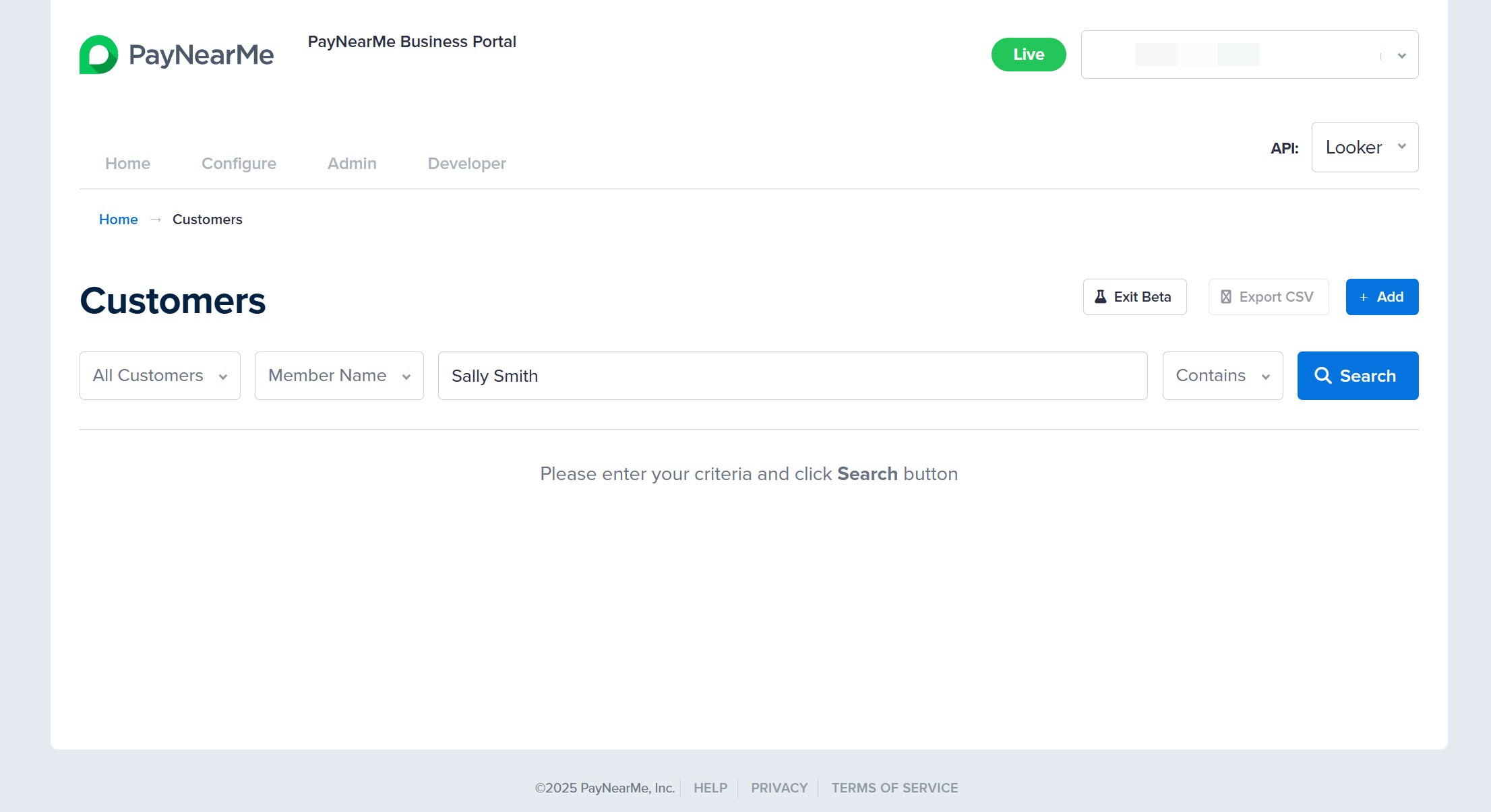 From the Business Portal homepage, click View in the Customers section. The Customers search page displays.