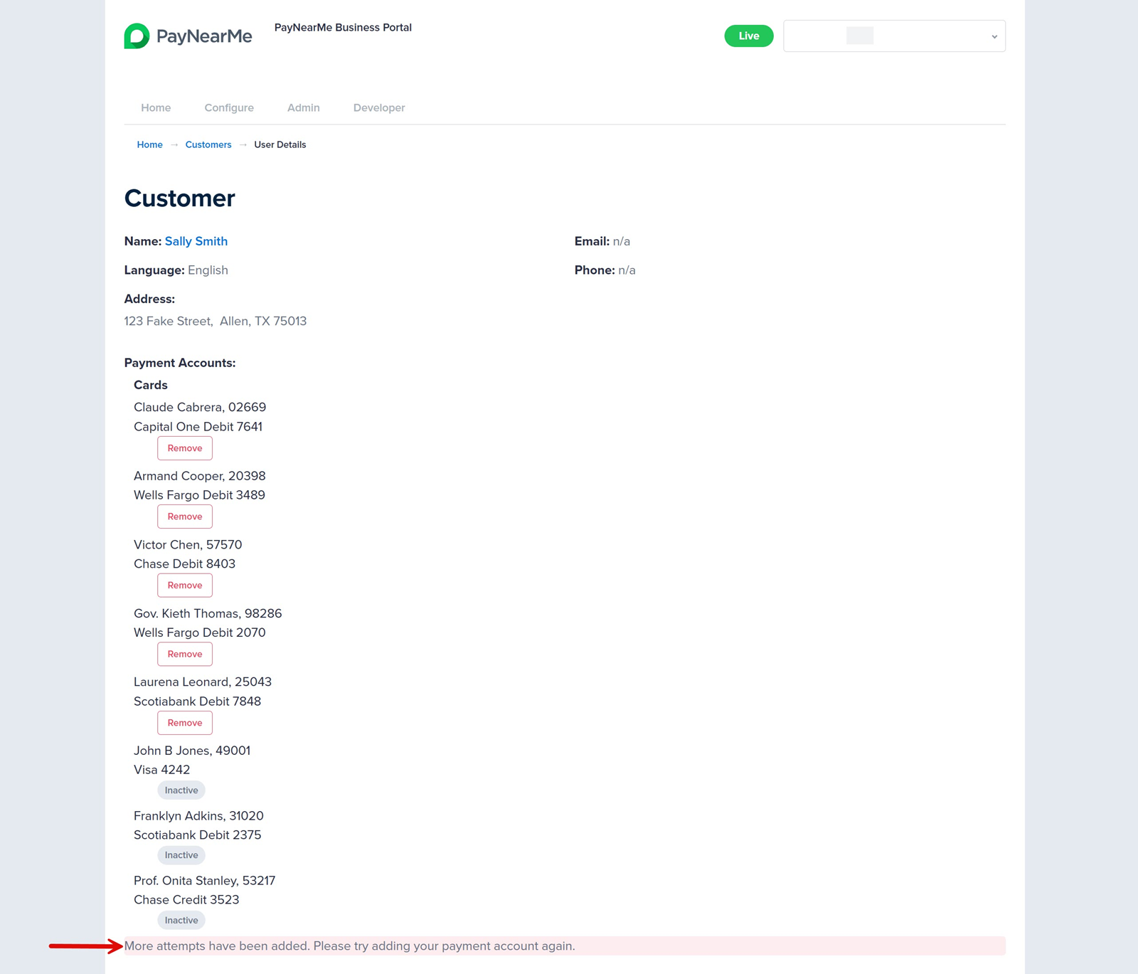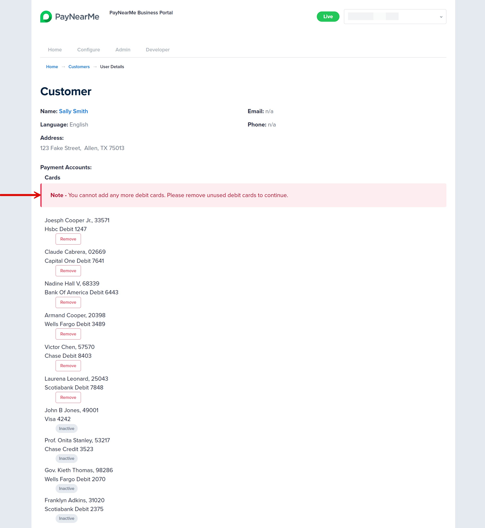 To remove an unused payment method, click Remove under each listed payment account. After removing the unused accounts, instruct the consumer to add his/her/their payment methods again.