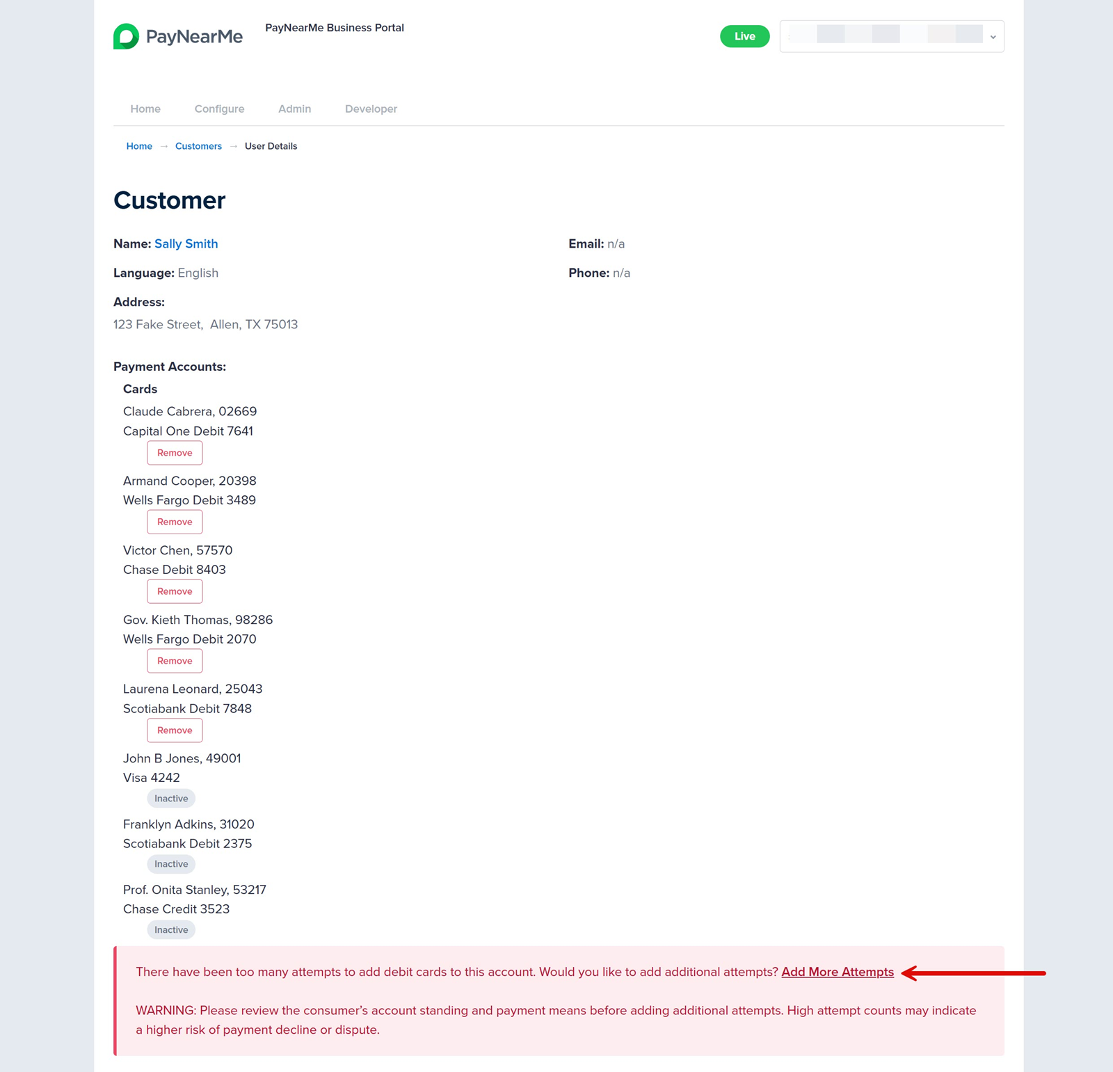 To manage risk, PayNearMe restricts the number of times that consumers can attempt to add a payment method to their accounts. To mitigate the friction this may cause for consumers, agents can reset the number of payment method creation attempts so that consumers can add more payment methods.