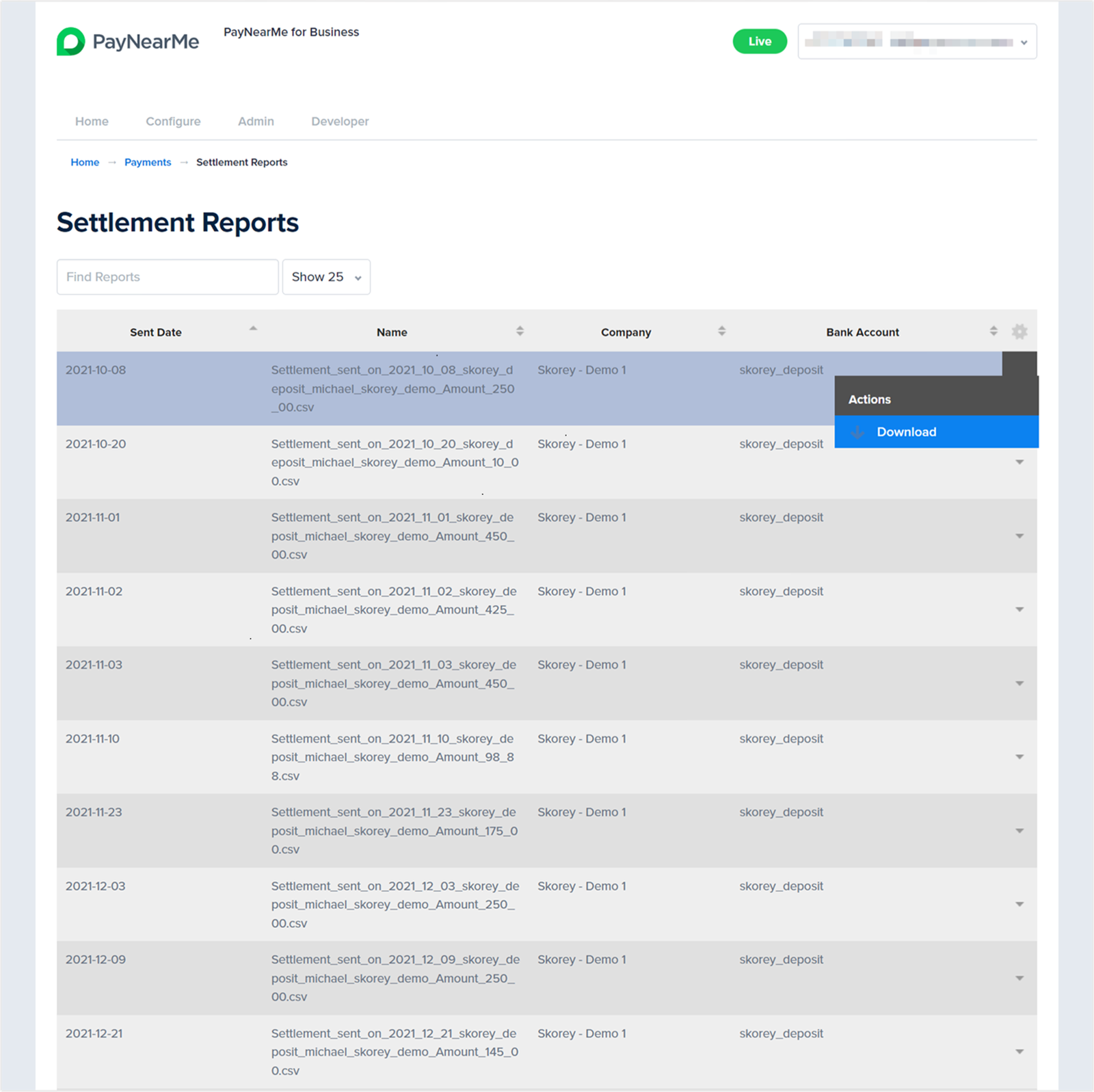 To download a settlement report, simply hover over the Actions arrow at the end of the row and select Download.