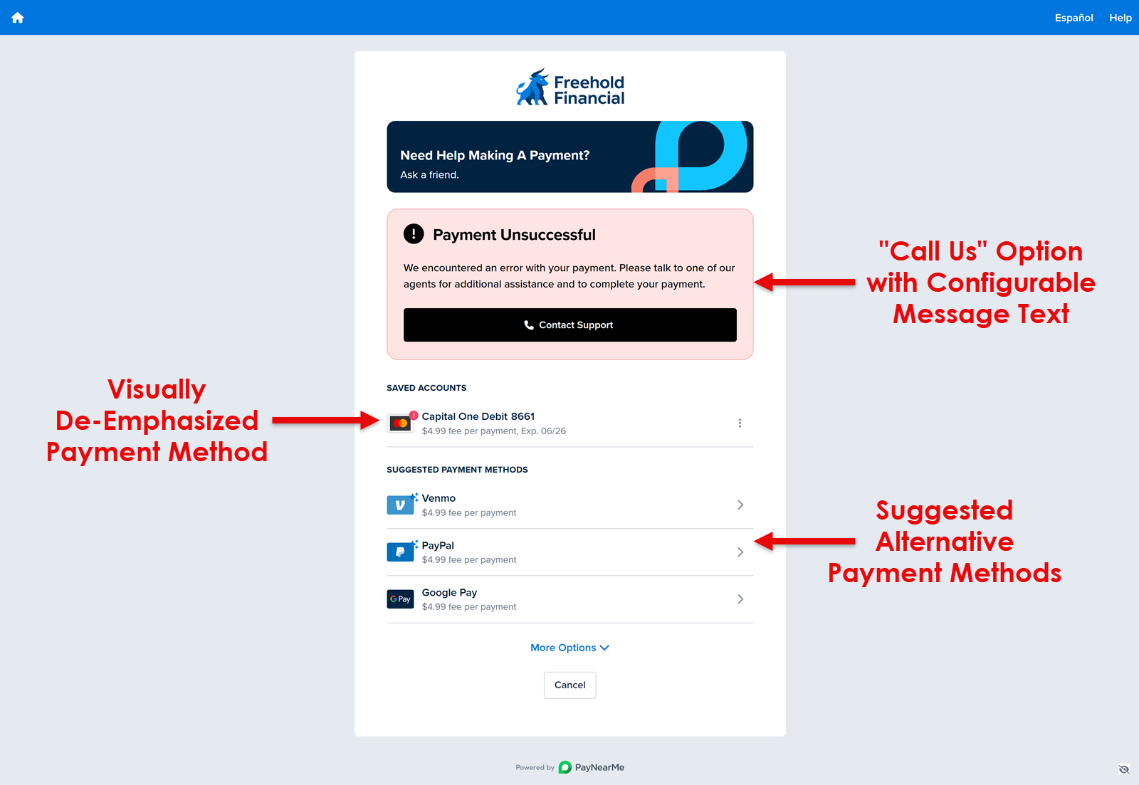 PayNearMe’s Dynamic Payment Options feature helps consumers recover when they hit repeated failures on the same saved payment method during checkout. After a configurable number of consecutive failures (typically two), the payer sees a dedicated fallback experience where the failed method is de-emphasized along with the following fallback options: