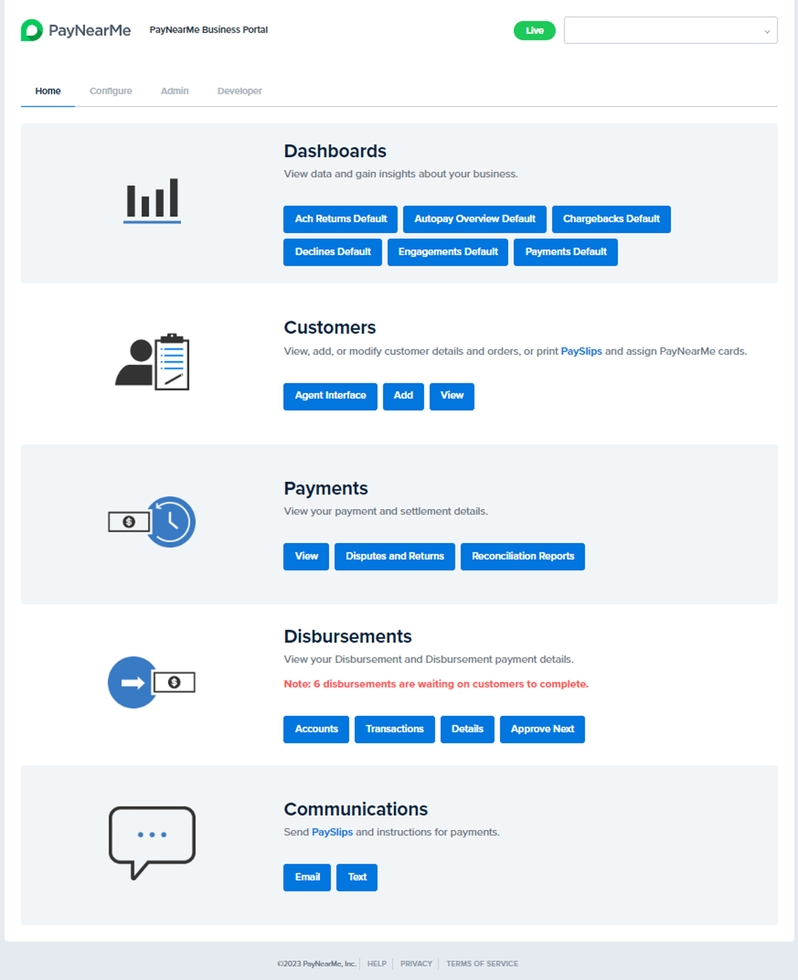 The Business Portal gives you the ability to view and manage customer, payment, user, and disbursement data, generate payment, settlement, and reconciliation reports, and access/test PayNearMe’s APIs using role-based access controls. The Agent Interface enables your Customer Service representatives to look up, add, and edit consumer accounts, send Smart Links via text or email, accept one-time payments, set up an Autopay schedule, request partial or full refunds, and manage the consumer’s saved payment accounts. The Agent Interface can be used as a standalone product or as part of the Business Portal.